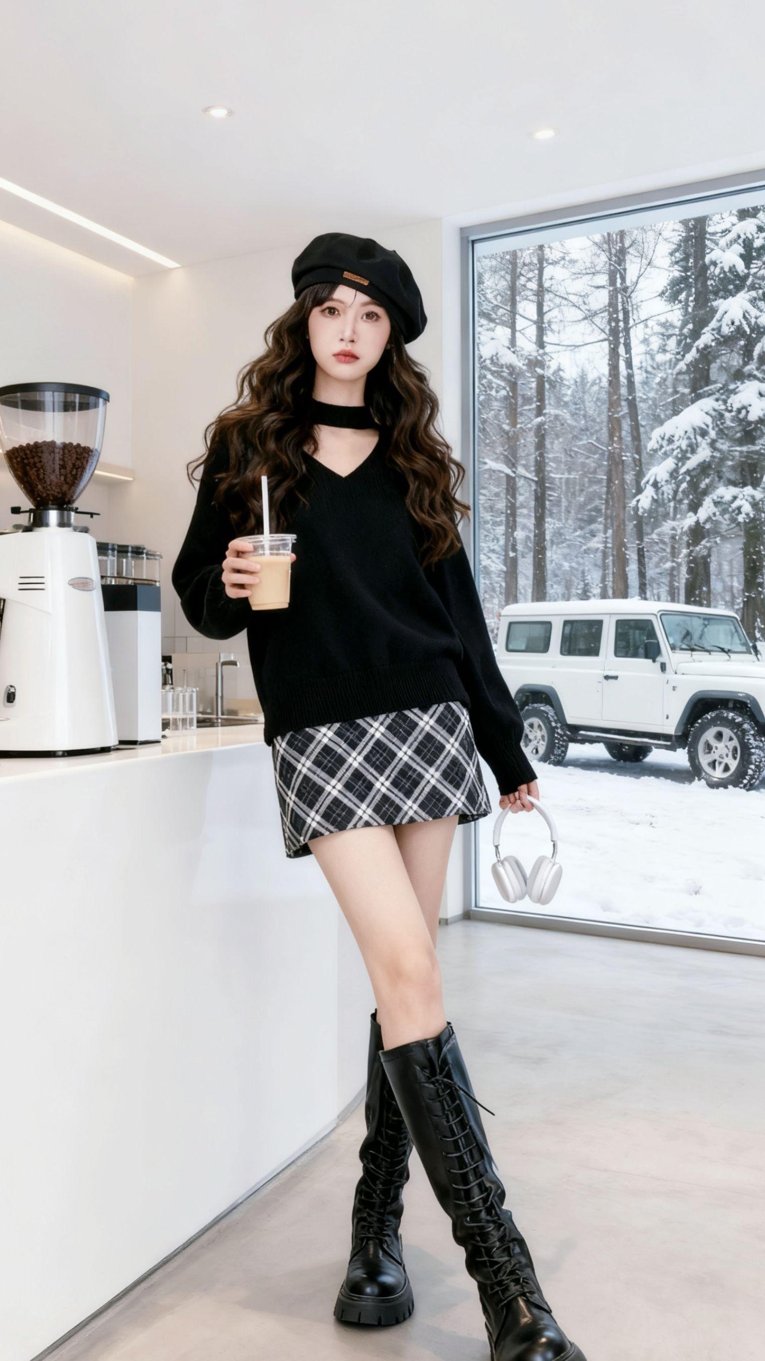 创作灵感 宝子们!挖到件春秋万能内搭——这件挂脖V领黑毛衣也太会了! 挂脖设计自带小性感,V领刚好露锁骨,宽松版型藏肉又慵懒,软乎乎的针织贴身穿巨舒服!单穿是清冷姐姐风,搭外套当内搭也不臃肿~ 配格纹短裙+厚底靴,甜酷感直接拉满,下雪天穿都不违和!春秋当外穿、冬天当内搭,一件顶N件,这性价比谁看了不心动!