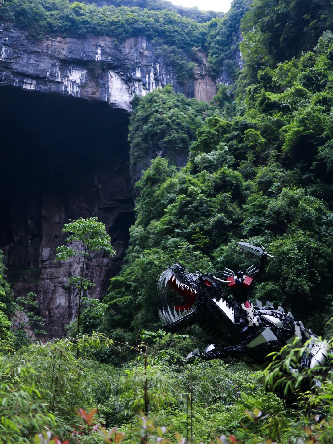 📍重庆武隆 《变形金刚》取景地·武隆天生三桥\nThe Tian Sheng San Qiao Scenic Area located in Wulong, Chongqing.Step into the world of \"Transformers\" at Asia's largest natural bridge wonder!\n🚘 交通 Transportation\n🚄火车 Train:重庆北站→武隆站→景区大巴直达游客中心\u2028Chongqing North Station → Wulong Station → Take shuttle bus to Tourist Center\n🚌大巴 Bus:重庆四公里枢纽站→武隆汽车站→景区直通车(全程约2.5小时)\u2028Sigongli Bus Hub → Wulong Bus Station → Scenic shuttle (2.5hrs total)\n🎫 门票 Tickets\n155元(含门票+中转车+观光电梯)\n¥155 (entry + shuttle + elevator)\n🥾 玩转天生三桥!Tour Route\n⏱ 3-4小时奇幻旅程 | 3-4hrs of adventure!\u2028🚏乘透明电梯直降百米深谷或徒步下山\u2028➡️打卡天龙桥+唐朝驿站天福官驿(《满城尽带黄金甲》取景地)➡️青龙桥下仰望\"神鹰天坑\"➡️黑龙桥下看瀑布四泉飞泻➡️返程:乘电瓶车或徒步15分钟至出口\u2028🚏Glass elevator down 100m canyon or hike➡️Tianlong Bridge+Tang Dynasty \"Sky Fortune Post\" (film site of \"Curse of the Golden Flower\")➡️Qinglong Bridge: Gaze up at \"Eagle Pit\" ➡️Heilong Bridge: Chase waterfalls & hidden springs➡️Return:Hop on buggy or 15-min walk to exit\n
