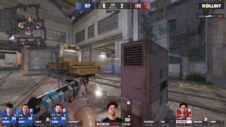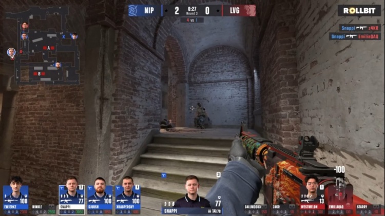 上半场LVG先攻,手枪局LVG五人红楼梯来内场,NIP三人回B,r1nkle全白先杀三叶后狂轰三杀,单局四杀,NIP1-0LVG。