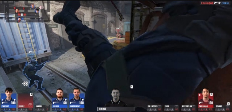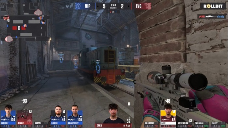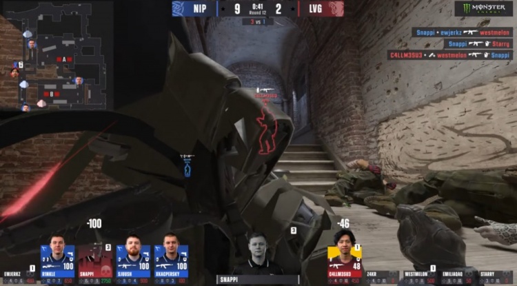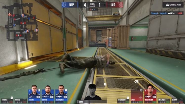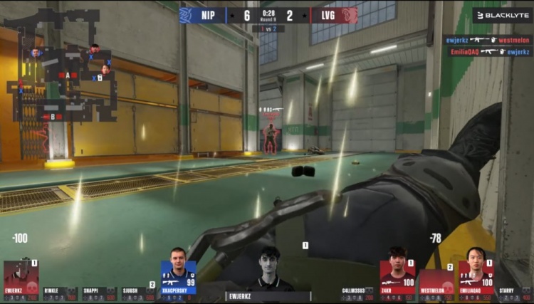 第5局回到长枪,LVG瞬间冲外场,r1nkle与ewjerkz瞬间被杀,西瓜打掉Snappi,三叶在A下包后再杀xkacpersky,sjuush在绿通被西瓜击杀,NIP4-1LVG。