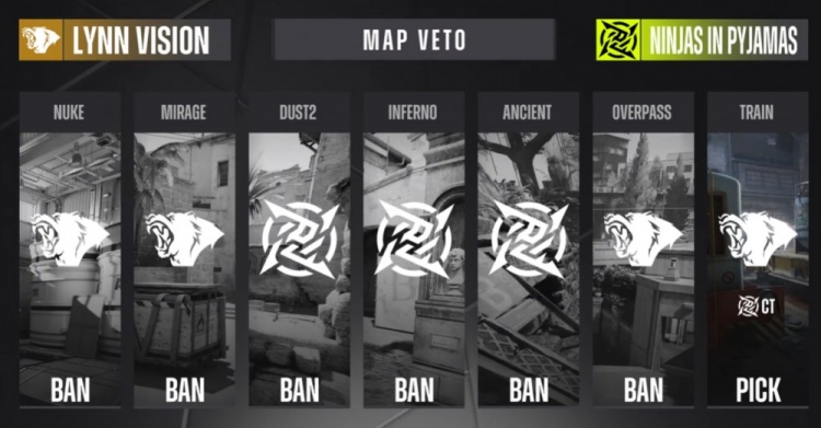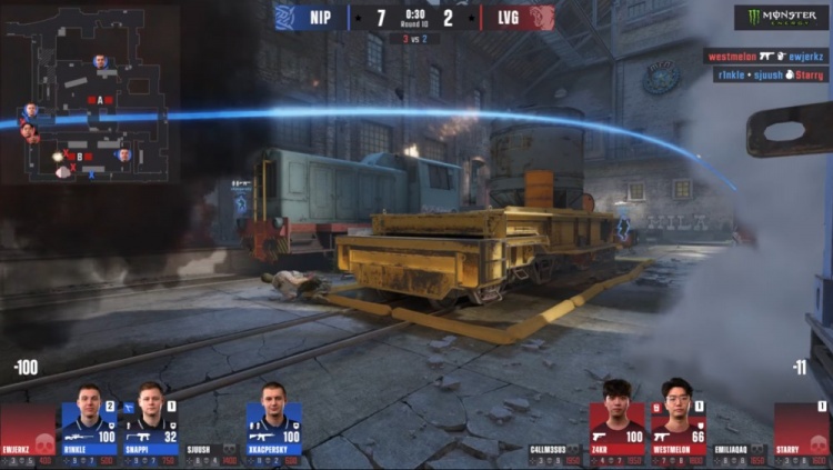 第9局暂停回来,LVG爆弹冲红楼梯,sjuush红楼梯反清击杀Su3与Starry后顺利撤退,绿通三叶大狙轰掉r1nkle,sjuush再回红楼梯被西瓜打掉,绿通3v3,西瓜爆杀Snappi,但xkacpersky残局1v2,外场烟雾弹后上火车爆杀Emilia与三叶,NIP7-2LVG。