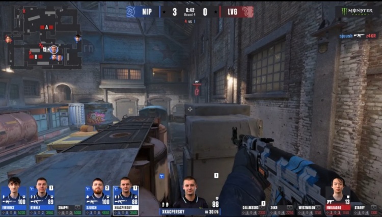 第4局LVG半起,xkacpersky见面手雷送西瓜上天,Su3一把Tec-9反杀Snappi,随后LVG集结四人红楼梯冲B,r1nkle先杀Su3,sjuush双杀Starry与三叶,Emilia孤立无援,NIP4-0LVG。