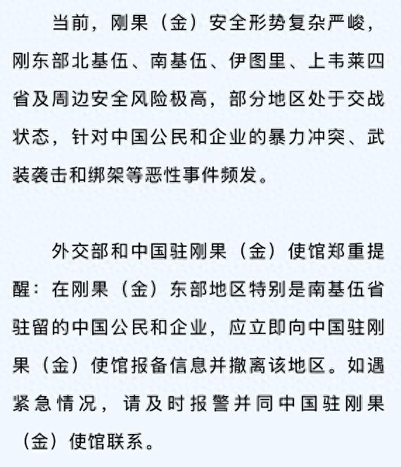 外交部和中国驻刚果(金)使馆郑重提醒:在刚果(金)东部地区特别是南基伍省驻留的中国公民和企业,应立即向中国驻刚果(金)使馆报备信息并撤离该地区。如遇紧急情况,请及时报警并同中国驻刚果(金)使馆联系。