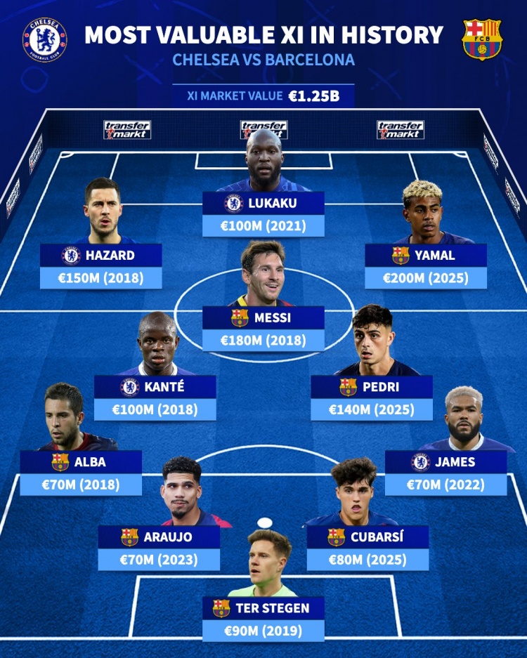 直播吧11月26日讯北京时间今晚凌晨4点,欧冠联赛阶段第5轮,切尔西主场迎战巴萨。赛前,德转评出这两支球队历史最贵11人阵容,其中梅西、亚马尔领衔锋线,阿扎尔、卢卡库在列。这套阵容的总身价达12.5亿欧元。