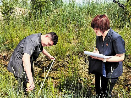 张家口中院环保庭法官到被破坏的金长城现场进行勘查。