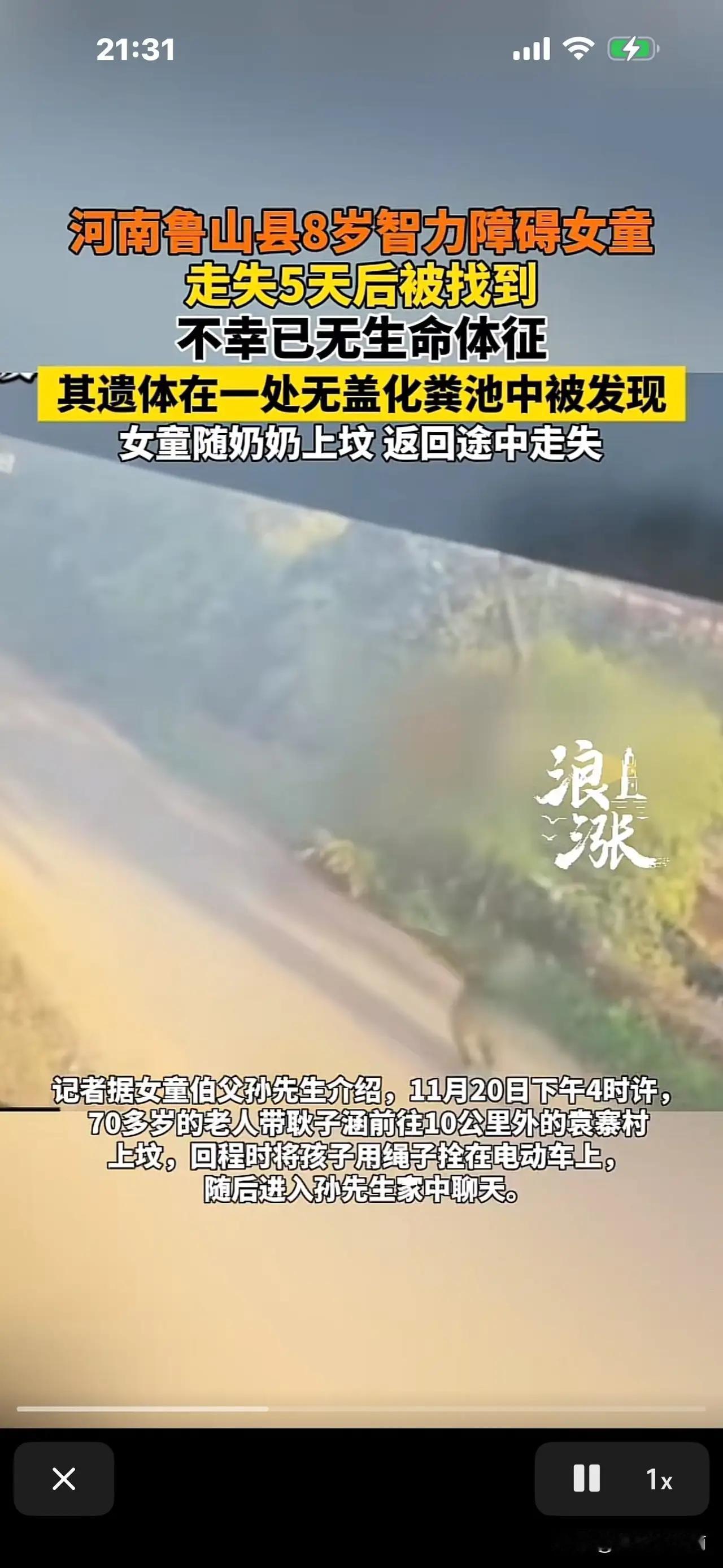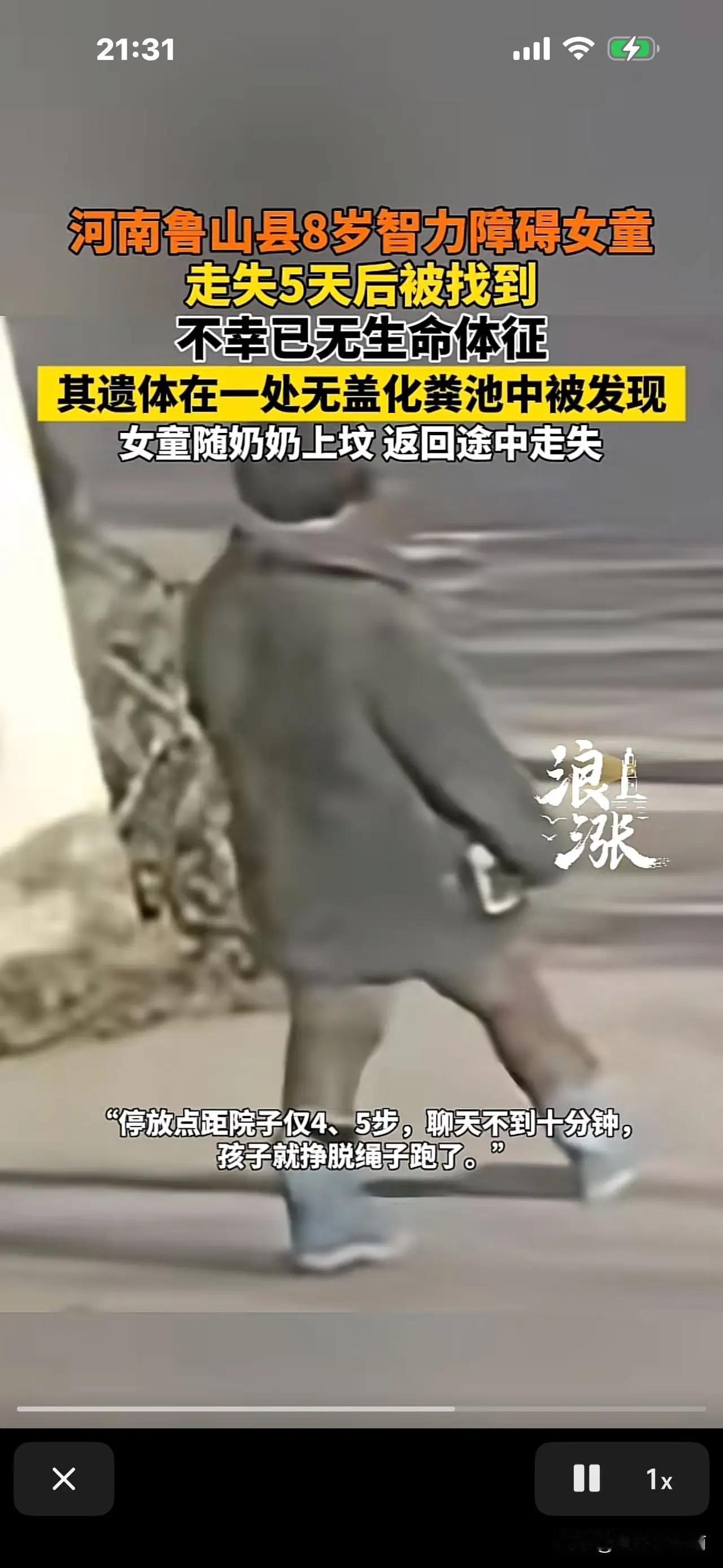 好不惜,河南鲁山8岁智障女孩已找到了,不幸在化粪池遇难,已去世5日,遗体浮上来才被发现! 不能为了有个后人,就盲目结婚,那可能是孩子一辈子痛苦的开始。 奶奶真心大,孩子不比寻常小朋友一样,就不要去找人聊天了,就算找人聊天也要带在身边。 孩子不能去坟地,就算她情况特殊不能一个人留在家里,必须带着,这个坟是不是非上不可? 明知道自己的孙女有病还把她一个人丢在院子外面你进去聊天,你这当奶奶的难责其咎,可怜的孩子。 应该好好的查一下,是不是有意的,如果放任不管,以后都会效仿,这种病,如果产检了会查出来的,可能都没产检。