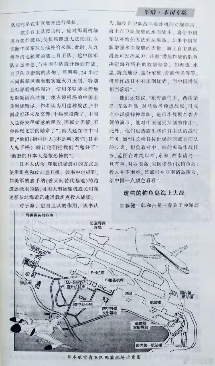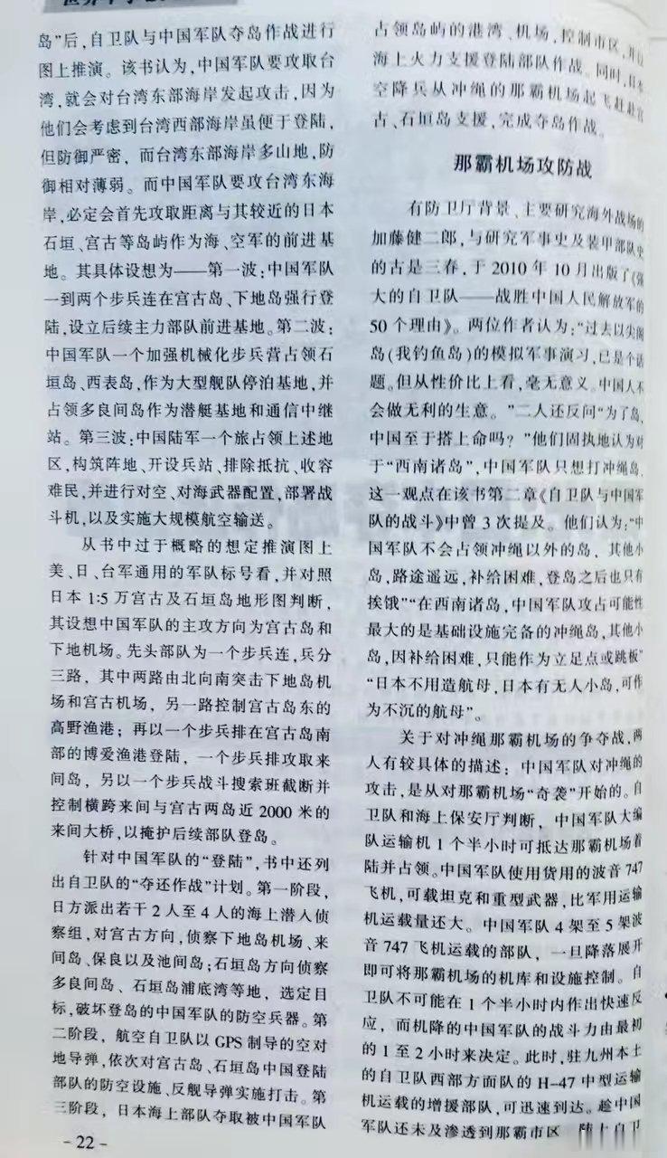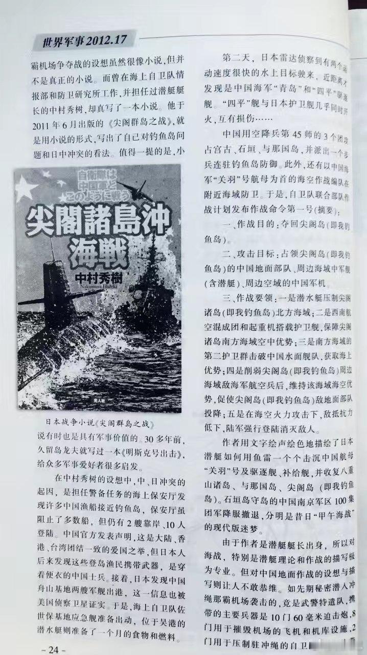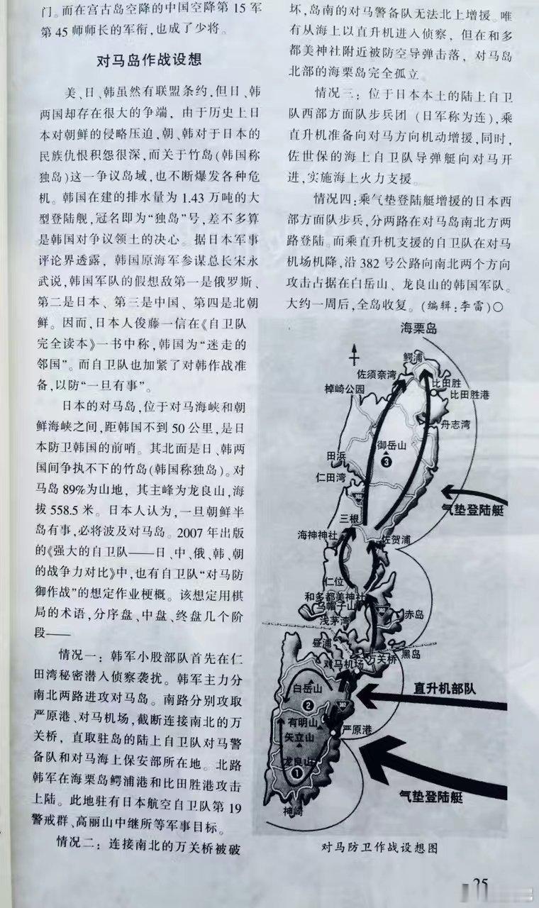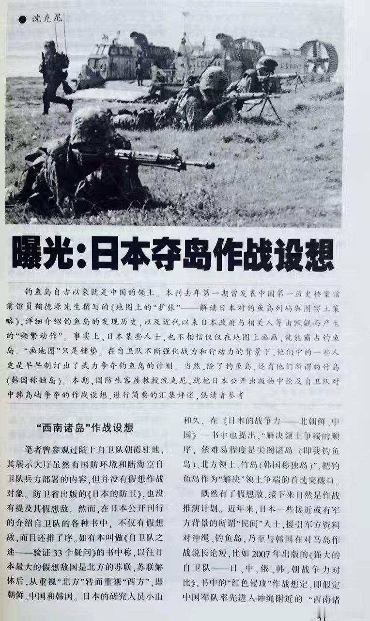 近日,日本右翼声称“一旦有事”要击沉我刚刚入列服役的“福建舰”航母。这使我想起十多年前我在日本看到的当过海上自卫队潜艇艇长的中村秀树,以”小说“的形式描述未来中日海战的“想定”,其中就有用潜艇击沉我航母”关羽“号的描写…… 我曾在2012年第17期《世界军事》发表《日本夺岛作战设想》的文章。我依据日本公开的书刊中对我国钓鱼岛的作战想定种种,以及日本与韩国岛屿之争的作战设想汇集概述。同时发现由于历史原因,日韩之间的竹岛或说独岛之争,军事关系紧张。实际上韩国假想敌的排序日本竟先于中国! 十三年前我在《世界军事》写过《我眼中冲绳》,即琉球的战场观察、还有北海道为战场背景的《日军严寒地区战斗训练》等文章。身为预备役军人,地处塞北,目光却在海上……