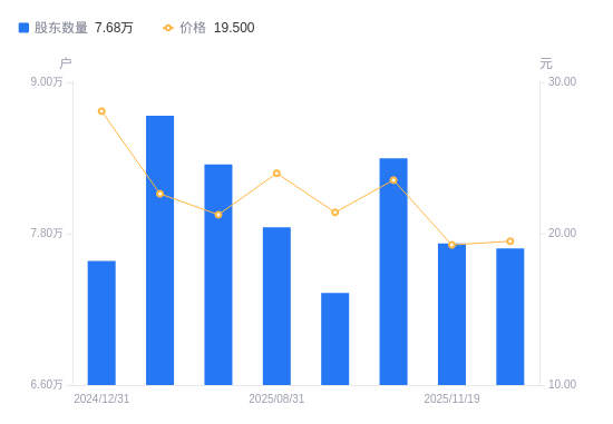 日期A股户数(户)流通A股户均持股数(股)户均持股市值(万元)2025-11-20768376592.4012.862025-11-19772226559.5312.632025-09-30839816031.6014.202025-09-19733006910.5114.802025-08-31784986382.1115.312025-06-30834926000.3712.752025-03-31873465735.7312.982024-12-31758486605.2218.562024-09-302825517731.1321.642024-06-302974716841.8013.49