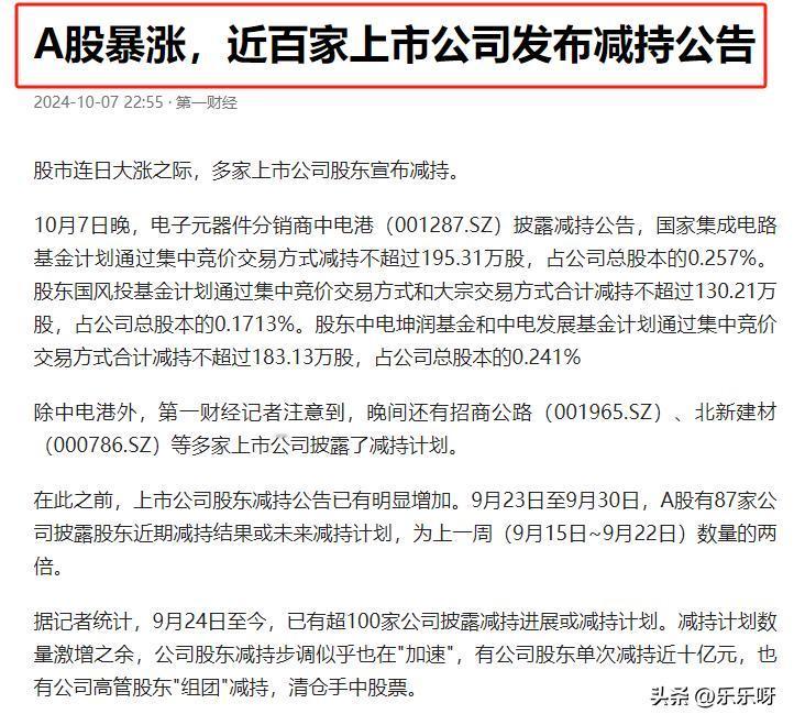 节假日之后,A 股市场呈现出一片疯涨之势,让人不禁惊呼:牛市真的来了吗?然而,值得注意的是,在10月 7 日晚,第一财经报道称,近百家上市公司竟纷纷发布了减持公告。这一现象引发了众多网友的疑问:为何在 A 股暴涨之际,百家上市公司的股东们选择减持,而不是趁此机会多赚点呢?他们为何要在这个时候离场,而不是与市场一起继续上扬呢? 与此同时,大量散户却在拼命入场加仓。这就形成了一种鲜明的对比,上市公司股东急于减持,而散户们则满怀期待地涌入市场。有网友就说,这些股东们大量持股,若散户不够买,他们又如何套现抛售呢?毕竟他们已经在股市中坚守了许久,甚至有很多人一直在那赔了好几年。 对于股市,很多人可能像我一样并不十分了解。但个人认为,在当前这种经济环境下,股市的上涨估计也就是政策导向刺激下的个别现象,就如同地产市场一样。整体市场要想实现大涨并非易事,能稳住不走低,经济逐步走上正轨,才可能让市场恢复一些生机。 但目前的情况确实让人充满疑惑,为何在看似一片向好的形势下,上市公司股东们却做出了与散户们截然相反的选择呢?这背后究竟隐藏着怎样的经济逻辑和市场考量,实在值得我们深思。