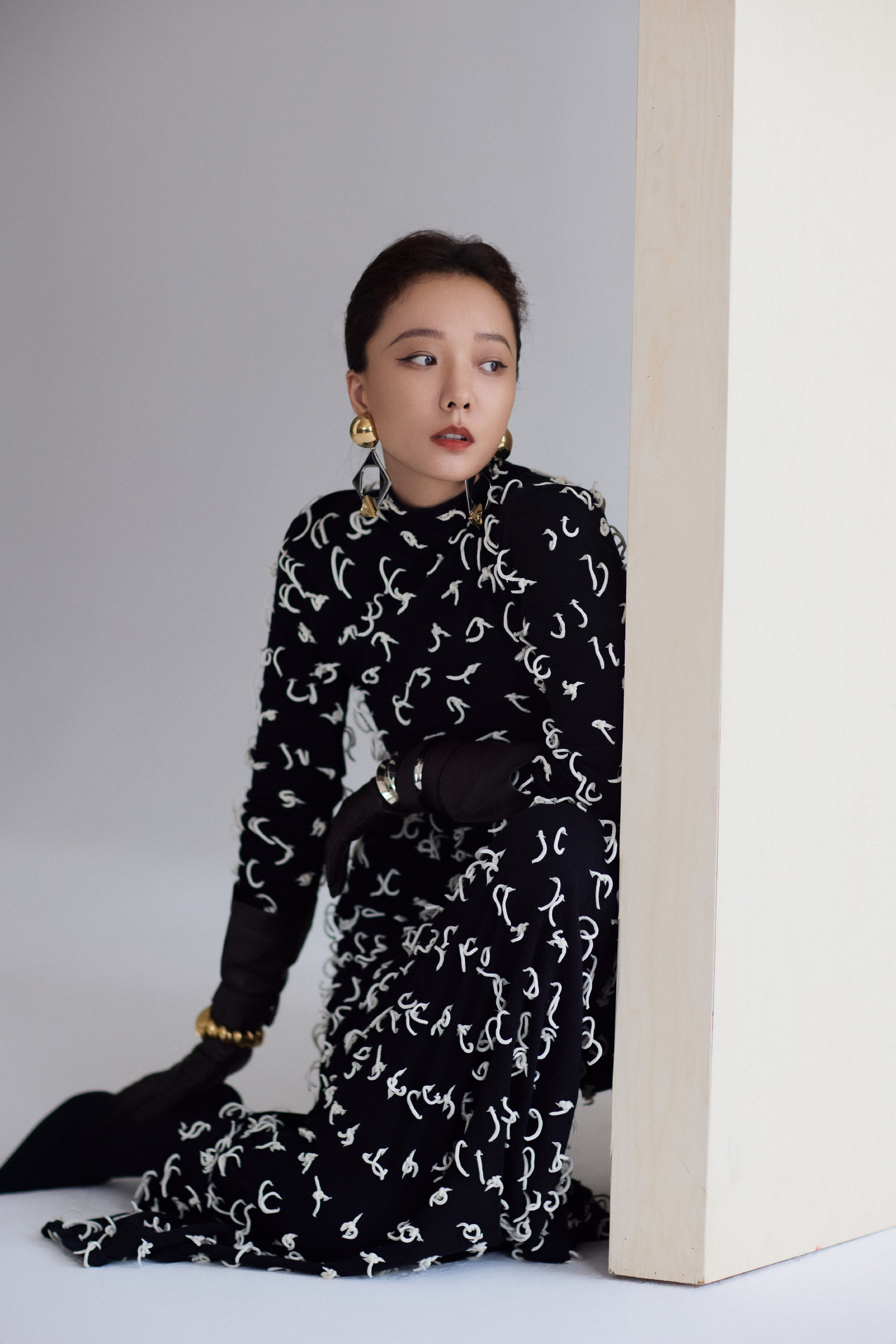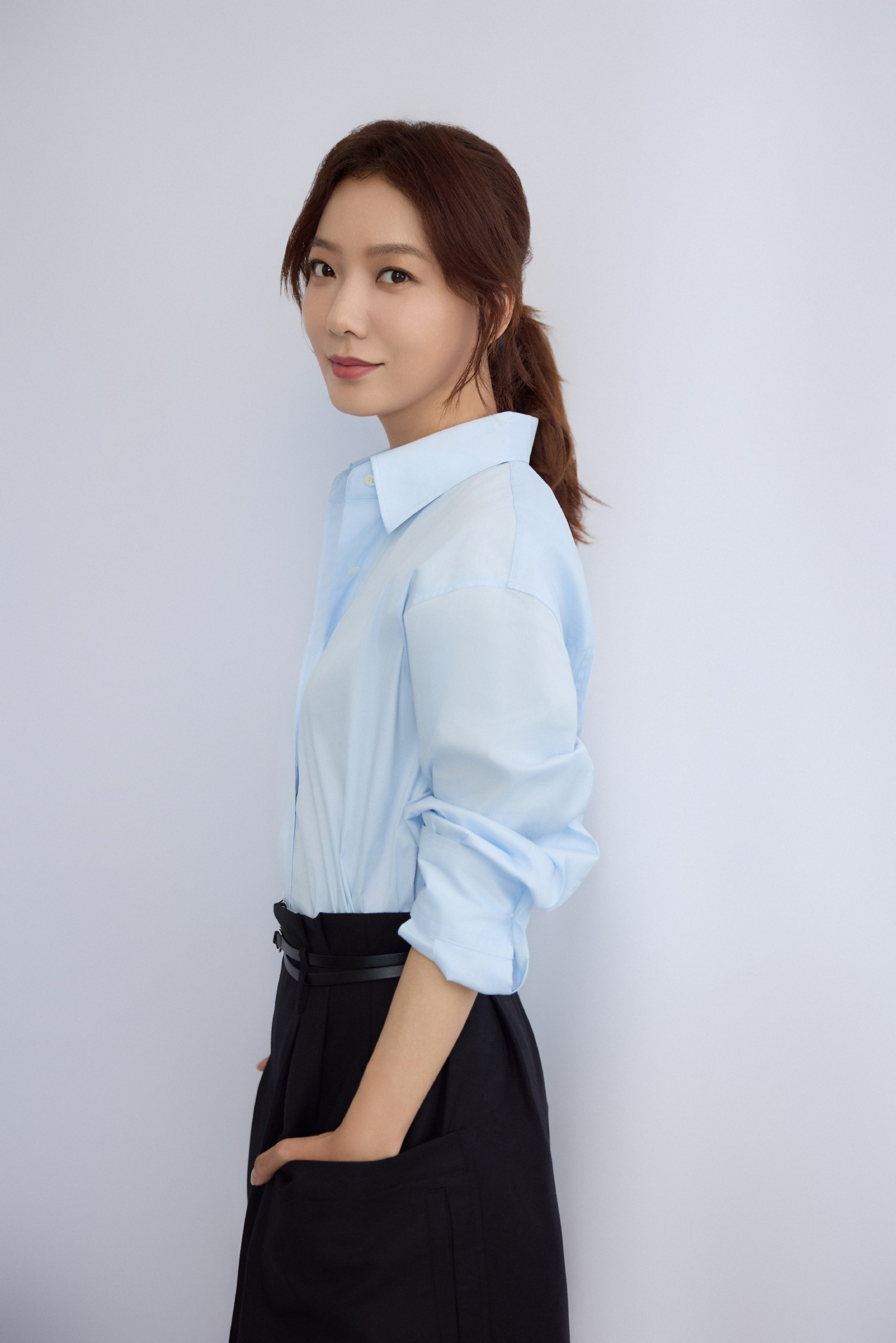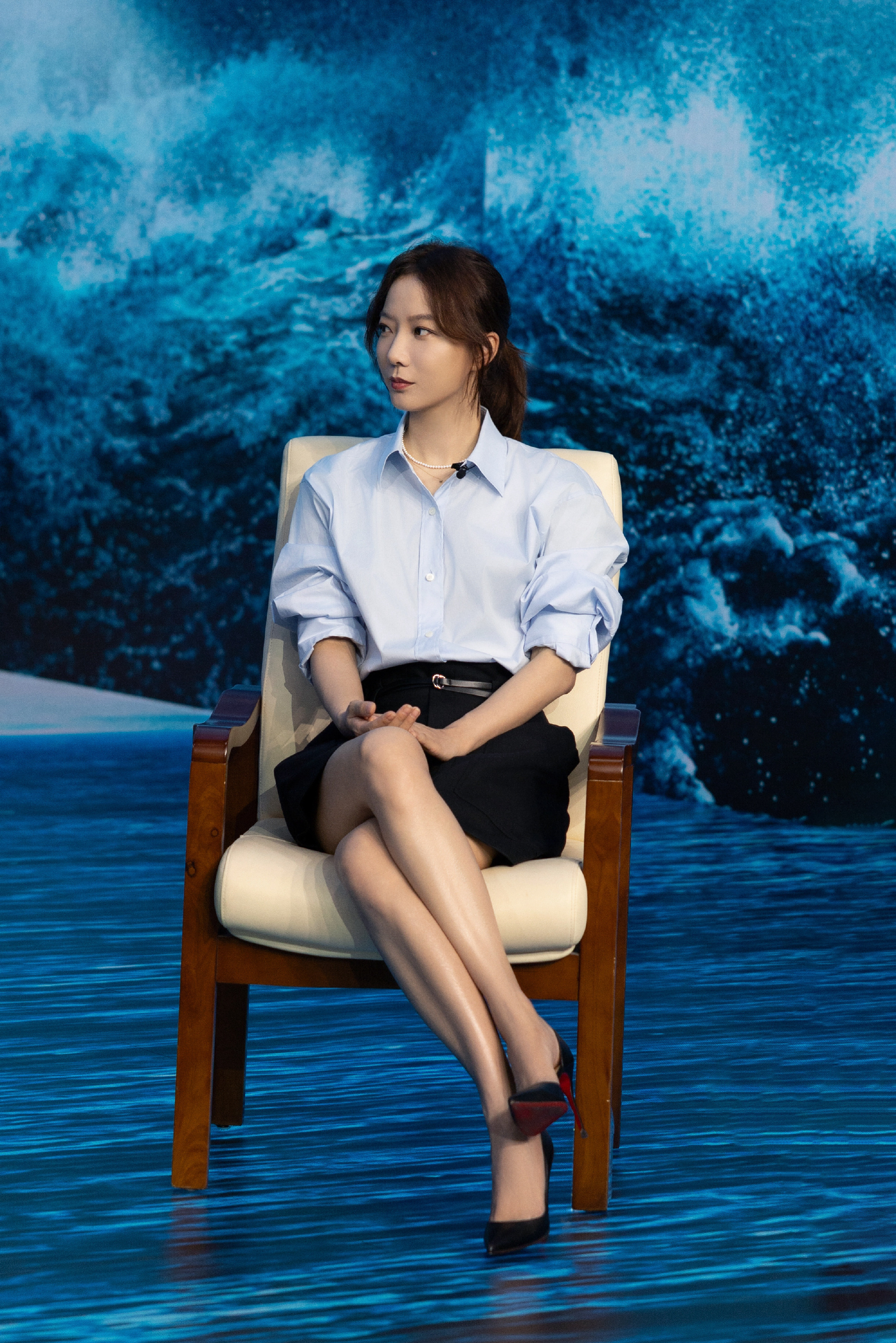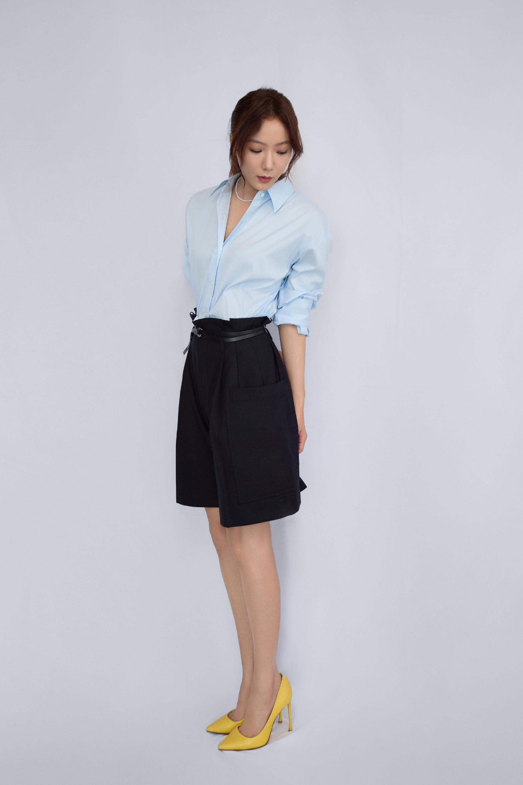 王珞丹 蓝衬衣黑短裤清爽怡人 轻抚长发 面容姣好 长腿修长 熟韵横生