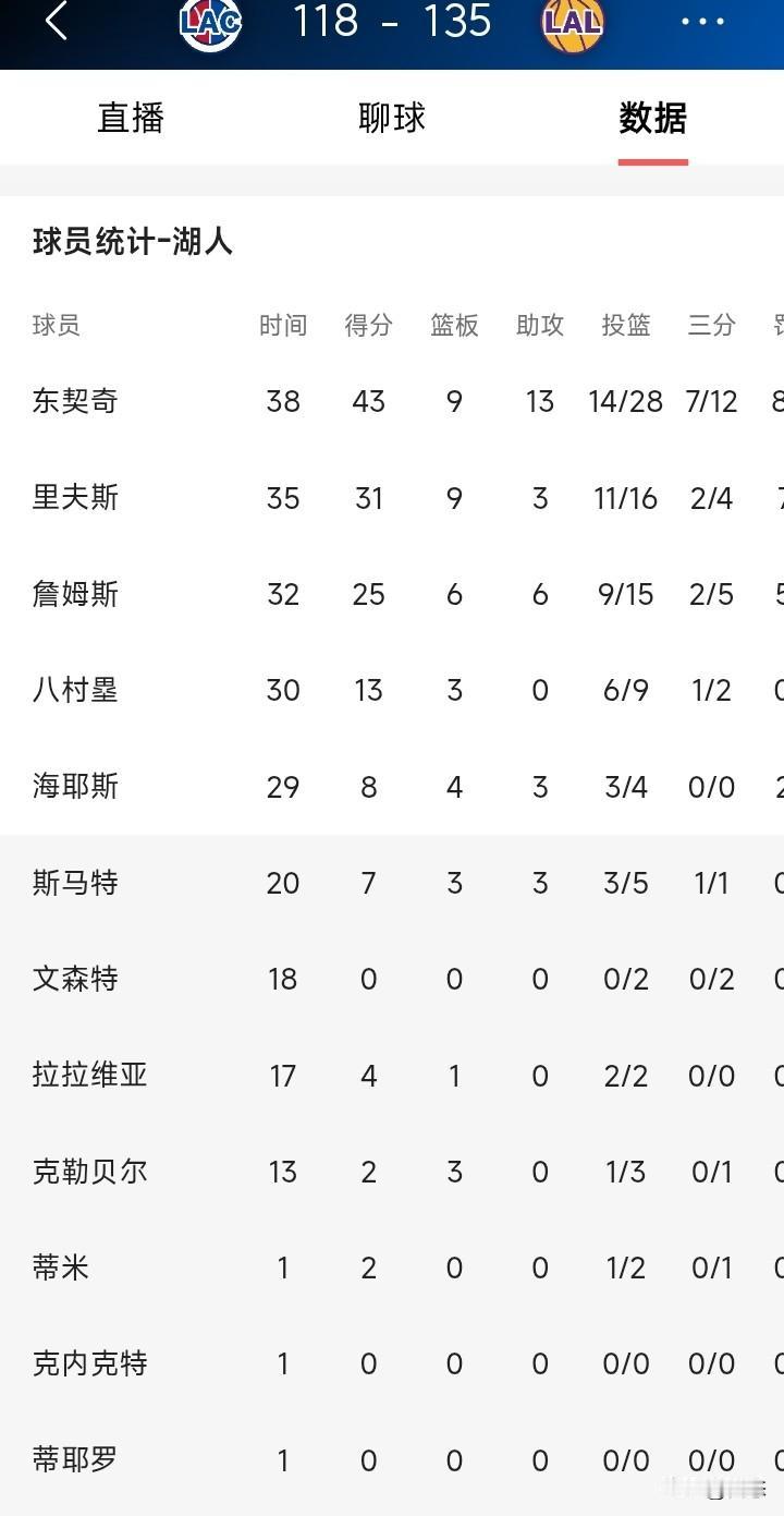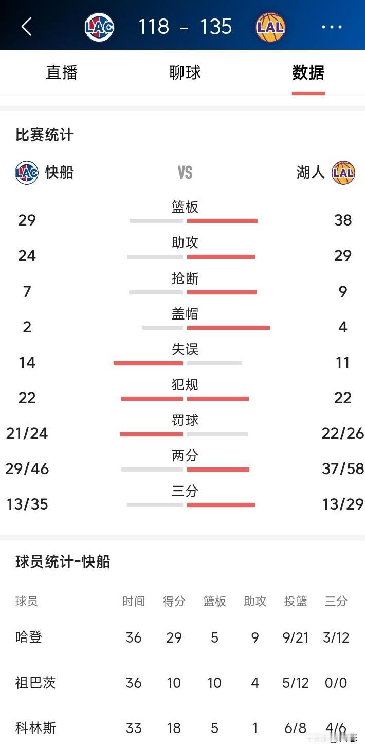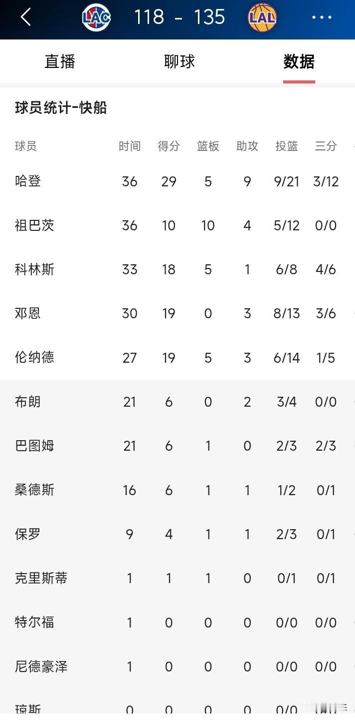 湖人和快船的比赛,可以说没什么悬念,即使是伦纳德上场,快船还是118比135输球。快船前两节还是打得有来有回的,到了第三节又是熟悉的场景。到了第四节主力上来也无济于事。 湖人没想到詹姆斯拿下25分,作为一个40左右的人,居然得分能力还这么强,还打了32分,不知道那些动不动就轮休的人看到会不会脸红。 詹姆斯如果还有人喷的话,那是黑子无疑了。 保罗没有拿下冠军还是有原因的,和詹姆斯一对比,可以说是一言难尽啊! 对此你们怎么看呢?