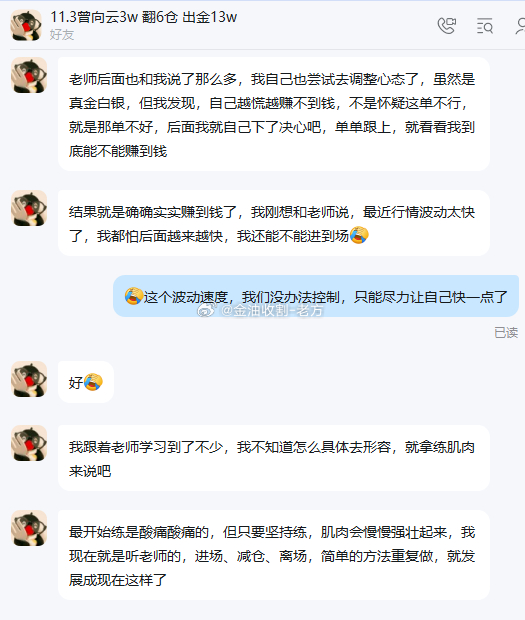 交易的尽头拼的是执行力 很多朋友都问过我一个问题,老师,这个市场能不能赚到钱,跟着你实盘能不能像小云的账户一样,稳步增长,这看似是指导老师实力高低,胜率比的问题。可是,大家忽略了人性,账户是在你自己手上紧握的,一两次的亏损你还有一往无前的勇气,但如果连亏3、4、5单呢。屏幕的朋友问问自己,还有信心跟下去?这是我今天的标题,为什么是交易的尽头不是技术,而是执行,如果你问我靠什么把那些曾让账户从反复亏损到后来逐渐稳定的投资者拉上岸。我会告诉你一句实在的话,也建议你先看完我实盘小云的回答,我们不是靠聪明交易,而是靠三个煎熬:1.熬过认知焦虑期,刚开始交易时我们总觉得自己懂得不够多,疯狂学习各种技术指标交易理论,这个阶段最典型的特征就是永远寻找更好的方法,MACD刚学会,觉得KDJ更准,趋势线刚掌握又听说波浪理论更神奇。结果就是不断更换交易系统。每个都浅尝辄止,真正突破这个阶段是当你明白市场上没有完美的技术,只有把简单方法重复执行到极致的交易者。2.熬过心理崩溃期,这是最艰难的一关,当你连续亏损,当你的账户资金不断缩水,那种自我怀疑会让你信心全无,这个时候很多人会选择冒险一搏,试图一把赢回来,而这往往是更大亏损的开始,真正能熬过来的人都学会了在情绪崩溃时依然坚守纪律、该止损止损、该清仓就清仓。不让一次失败影响整个交易系统。3.熬过孤独期和无人理解期,交易是条孤独的路,你的交易逻辑可能没人理解、你的坚持在别人眼里可能是固执,盈利是别人说你运气好,亏损就有人蹦出来笑话。早就说过的话,这种声音不绝于耳。能够熬过这个阶段的人,都建立起了内心的稳定秩序。需要特别说明,我这里说的熬,绝对不是让你死扛亏损或者麻不的重复错误,熬的真谛是在正确的方向上坚持,在痛苦的时刻依旧保持纪律。这就像锻炼肌肉,最开始总是酸痛难忍,但只要你方法正确并持续练习,肌肉就会慢慢强壮起来。交易能力的提升也是如此,每一次严格执行计划,都是在强化你的交易肌肉,当你真正把执行力内化成交易习惯,你会发现其实不需要那么多复杂的技术,简单的方法配合铁的执行力,就足以让你在这个市场上生存和发展。