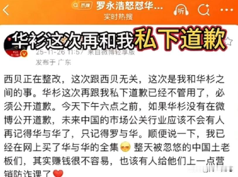 我太喜欢老罗的性格了,西贝、华与华这些企业真是充满了老登味儿,估计现实生活当中被人捧得太高了。 但是网友可不惯着他们,于是在互联网上一次次打脸,哪怕西贝被碾压性声讨,这帮人还是觉得自己没有任何问题,觉得是互联网充满了恶意。 今天凌晨,华杉一句被诱入黑白颠倒的网络罗刹国被人算计,直接点燃老罗的怒火,他越想越气,不过中午就放出了狠话,华杉这一次再和我私下道歉已经不管用了,必须公开道歉,下午6点前,如果没有公开道歉,未来中国的公关市场行业就不会有人再记得华与华了,只会记得罗与华。 不可否认,这帮曾经已经拿到过结果的企业家,他们确实很优秀,但如果只盯着过去的成就,活在当下,也许迎接他们的会是猝不及防的狼狈,毕竟时代不一样了呀。 六点已经过了这么久,华山依旧没有公开道歉,你说老罗到底会放什么料呢?老罗 华杉称西贝被算计 罗永浩怒怼要公布录音