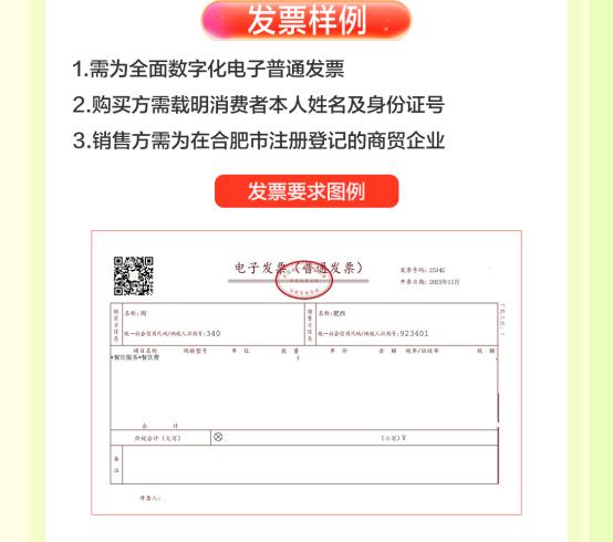 同时满足以下条件的发票纳入本次抽奖活动范围:消费者个人(自然人)通过实际消费后取得真实有效的全面数字化电子普通发票;零售业单张票面金额150元(含)以上,餐饮业单张票面金额200元(含)以上、住宿业单张票面金额200元(含)以上;在合肥市注册登记的商贸企业于2025年11月1日至12月31日期间开具。