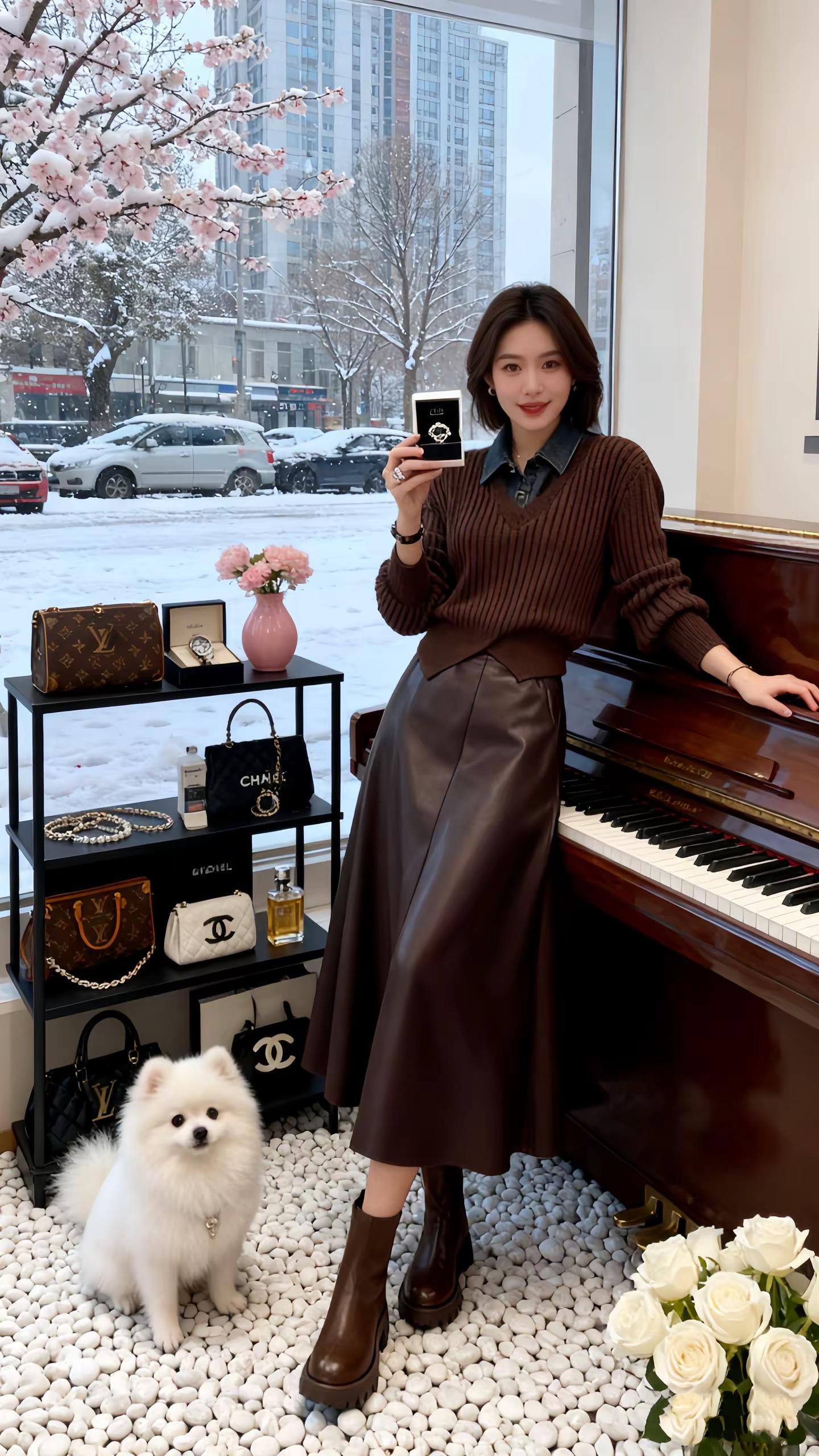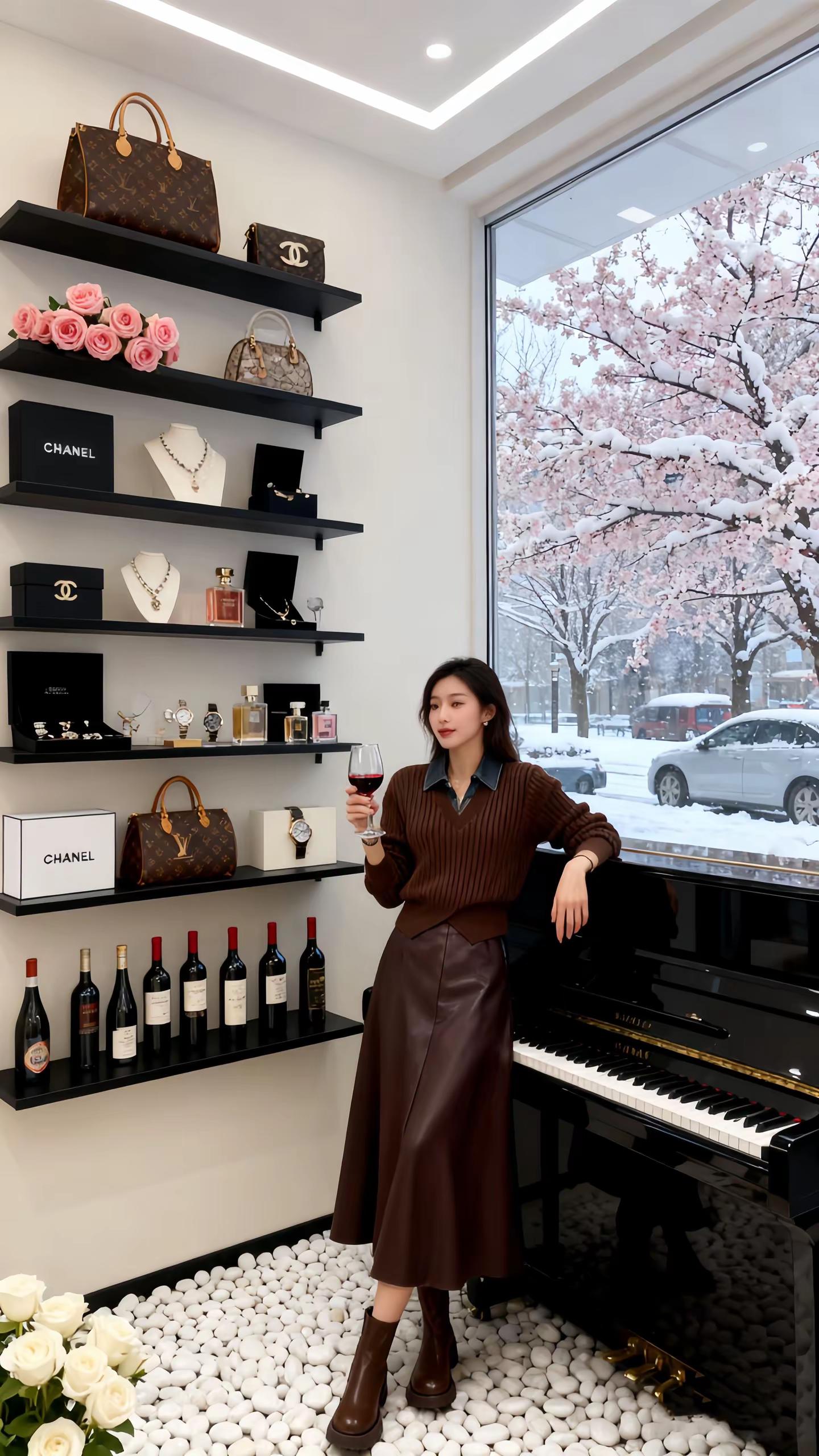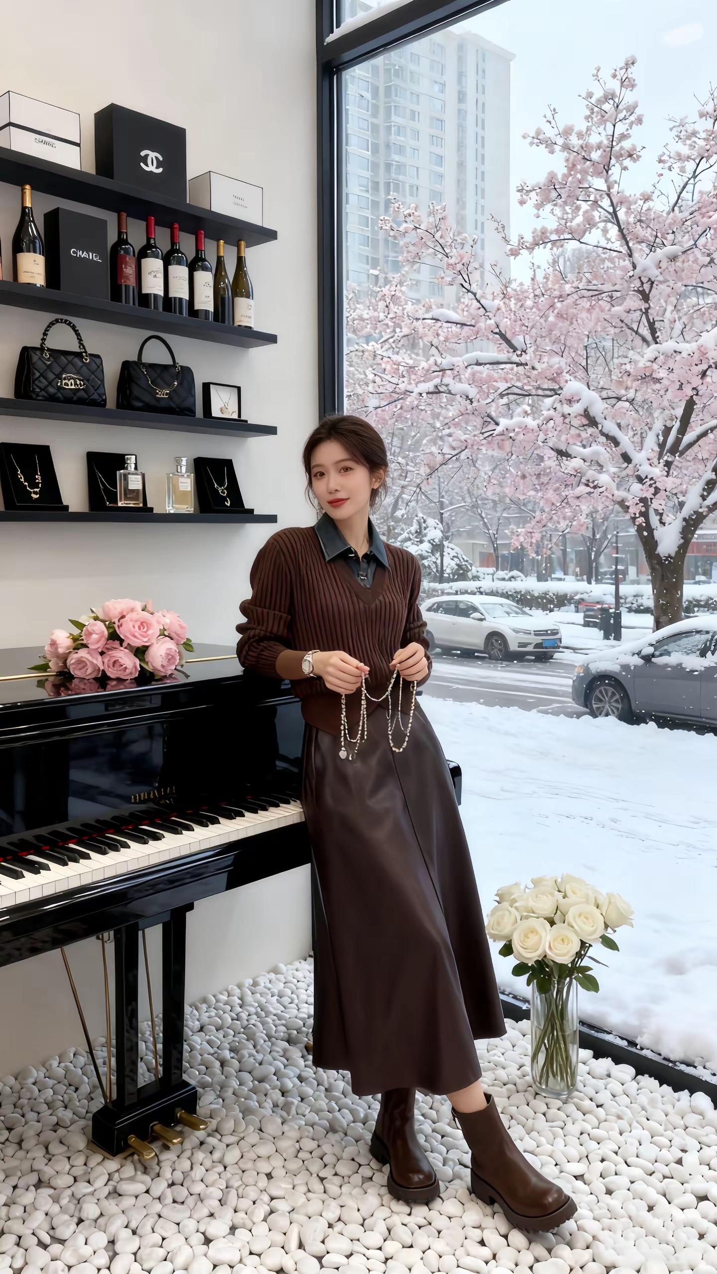 雪落在樱花枝桠上。雪落在樱花枝桠上的时候,这间店的暖光正裹着她身上的棕调——像把深秋的焦糖色揉进了冬装里。针织衫是竖纹的软,领口露一点牛仔蓝的边,像给温吞的棕加了粒脆糖;皮裙垂下去是宽宽的褶,走起来带点轻响,偏偏配了厚底靴,把柔的、飒的都捏在了一起。她指尖碰过模特身上的同款,羊绒的暖顺着指节漫开;或是靠在钢琴边转着红酒杯,身后置物架上的物件都成了衬——不是谁衬谁,是这一身棕,本就该落在有香调、有光泽的地方。踩在白鹅卵石上的靴跟轻敲两下,雪就从窗外的樱枝抖落了半片。这哪里是穿衣服,是把秋冬的温软和利落,都穿成了伸手就能碰着的好看。穿搭 把秋冬专属氛围穿上身 都市丽人的秋冬高智感穿搭 冬季穿搭主打一个精致又实用 我的降温穿搭既保暖又好看