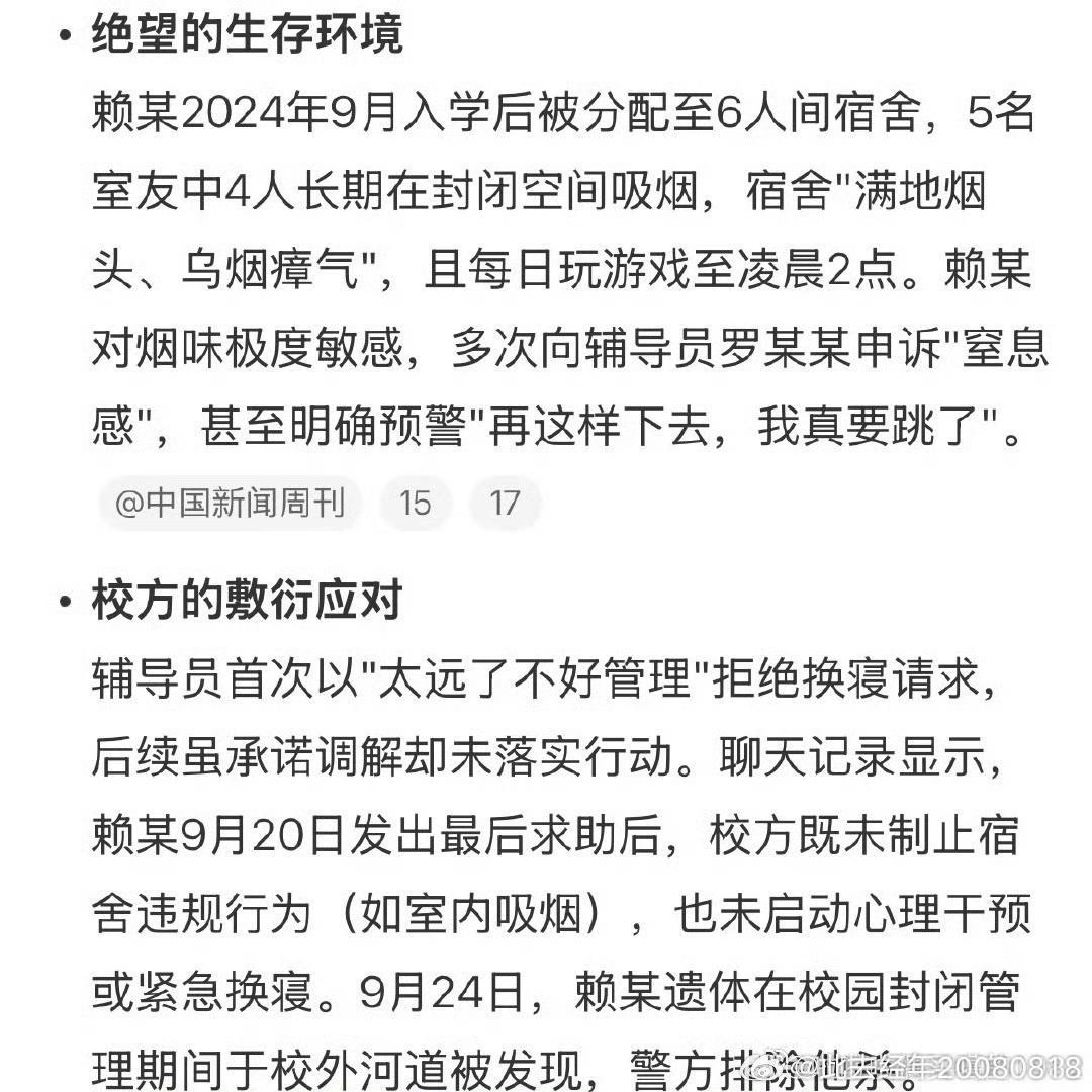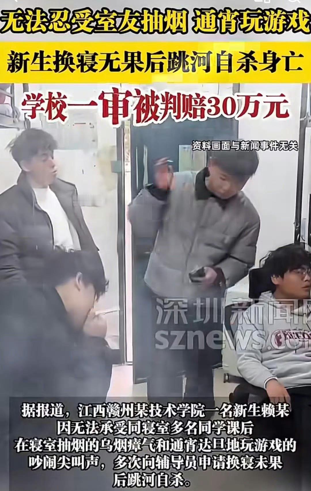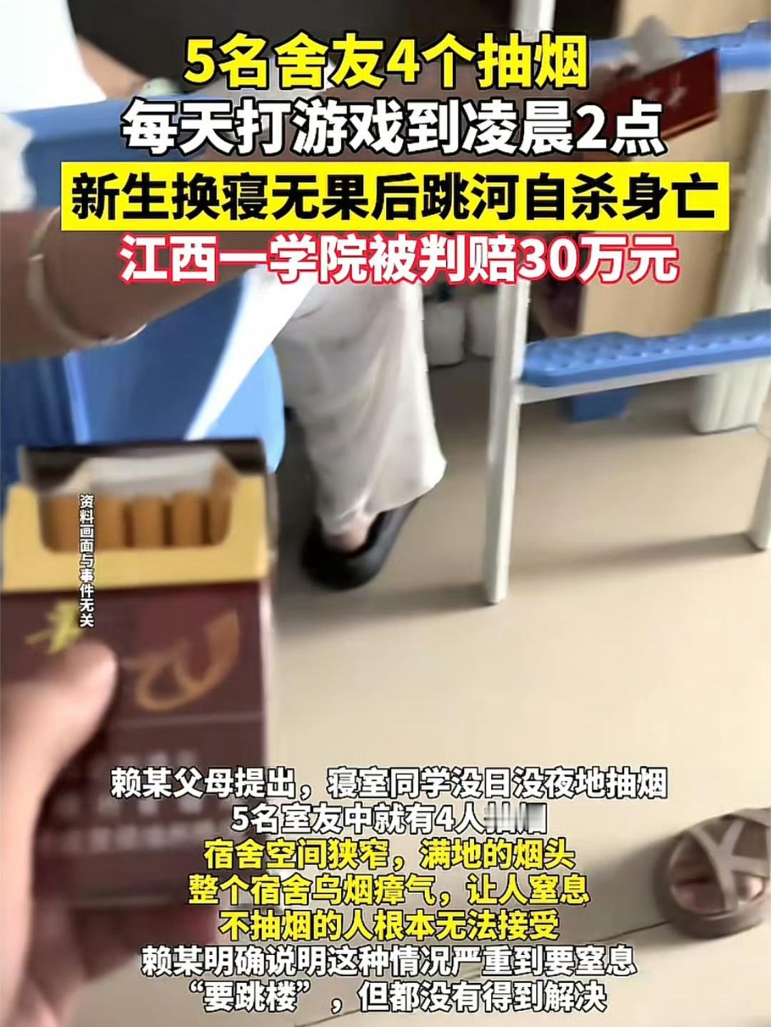 新生不堪室友抽烟、通宵游戏折磨,换寝无果后跳河自杀,学校被判赔30万 在大学校园里,宿舍本应是学子们休憩与学习的港湾,然而江西赣州某技术学院的新生赖某,却在这样的“港湾”里遭遇了噩梦。 赖某刚踏入大学校园不久,就陷入了无尽的煎熬。同寝室的多名同学,课后在寝室里肆意抽烟,乌烟瘴气的环境让他难以呼吸;更让他崩溃的是,这些同学还通宵达旦地玩游戏,吵闹尖叫声不绝于耳,让他根本无法正常休息。 不堪其扰的赖某,多次向辅导员申请换寝,可一次次的请求都石沉大海。在长期的精神折磨下,这个年轻的生命最终选择了以跳河的方式结束痛苦。 悲剧发生后,赖某的家属将学校告上法庭。法院一审审理认为,学校在宿舍管理以及换寝处理上存在明显不当,这种不当与赖某的自杀存在因果关系,因此判定学校承担30%的责任,赔偿家属30.2万元。 这起悲剧为高校管理敲响了警钟。宿舍管理绝非小事,它关乎学生的身心健康乃至生命安全。 高校应当建立更完善的宿舍管理机制,对学生的合理诉求要及时响应、妥善处理,不能让学生在无助中走向绝路。 同时,也应加强对学生的行为规范教育,营造健康、文明的宿舍环境,让每一个学子都能在校园里安心学习、健康成长。