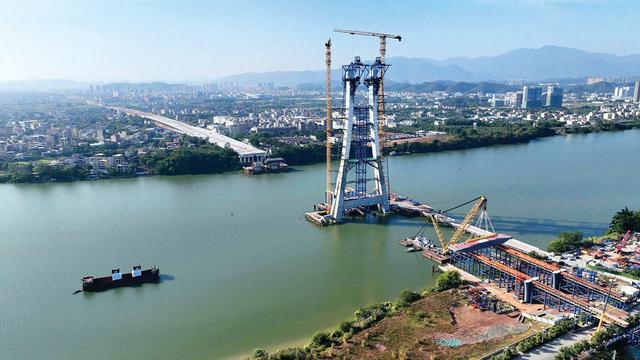 惠州1号公路是省重点项目,全长69.9千米,贯穿惠州南北,是“丰”字交通主框架中的一“竖”。东江特大桥横跨东江施工,跨度大、桥塔高,是项目施工难度最大的控制性节点工程。当前,惠州正抢抓施工“黄金期”,全力推进“丰”字交通主框架建设。