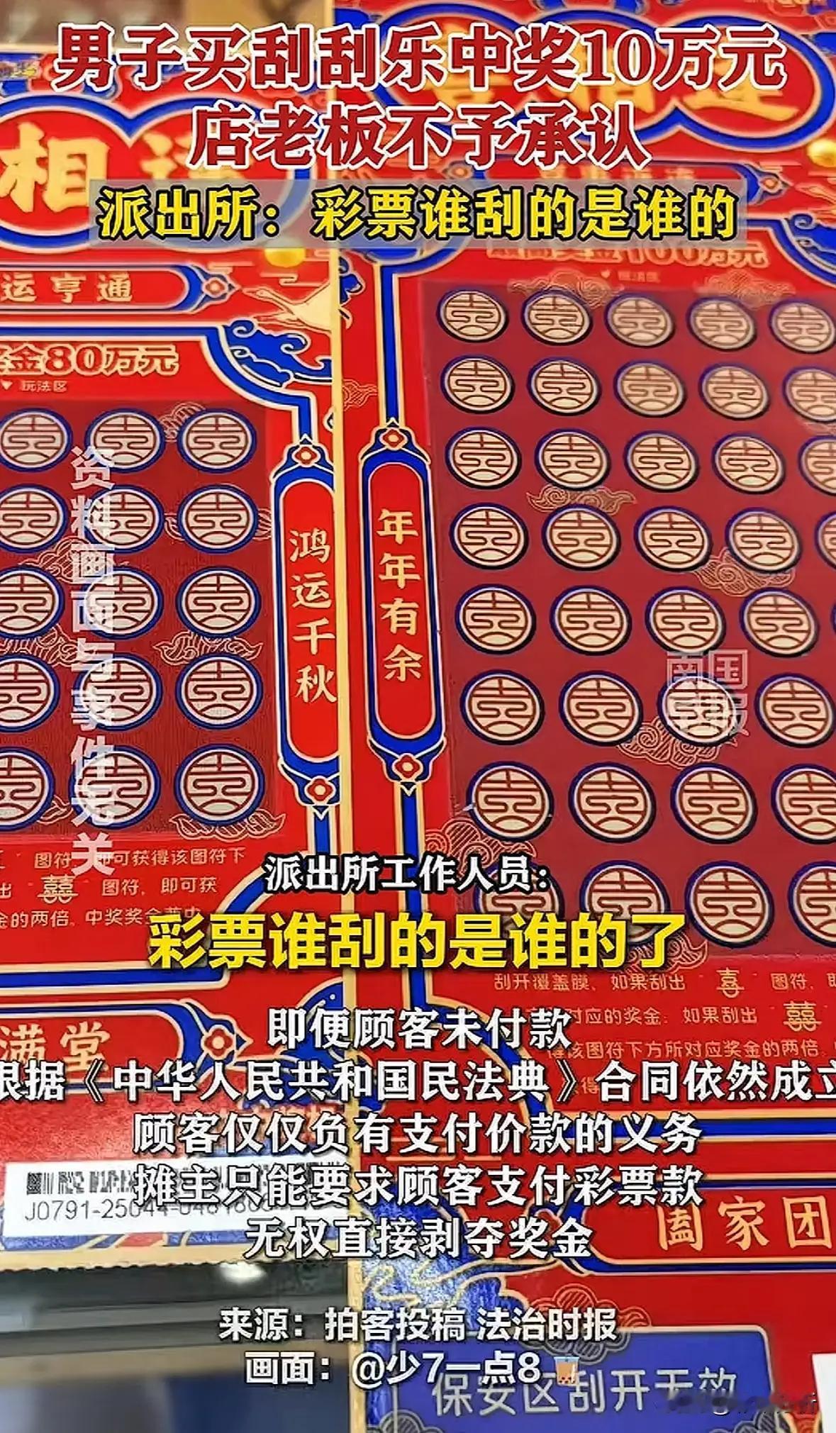 小伙刮中10万老板拒给奖票的事有后续了:民警的意见是谁刮的票那么归属权就是谁,显然支持小伙拿回奖票,但从视频看站主夫妇态度坚决显然绝不会轻易归还,民警的意见似乎也没有强制性,如果双方不能达成和解还是得打官司[捂脸][捂脸]。 人心太坏 彩票店 只要老板同意没有先给钱可以刮彩票 中不中都是消费者的。 只要以前出现过先刮后付款的情况,就是默许权力,这个就是刮奖人的,没有任何疑问,打官司店主也是败诉。 刮刮最大的奖也没多少,不给的话耍无赖以后彩票店也甭想开了,值得吗? 彩票店主安装摄像头,就是你刮票后付钱,最后耍赖,贪便宜呗,其实既然店主默认这张票是小伙子刮的,买卖合同已成立,前后付钱都一样。 刮中了直接付钱走人就行了,非要给老板说自己刮中了。 说了多少遍了,财不外露,刮中了你别声张直接付钱走人,十万老板又兑不了。 付钱才能刮,不付钱彩票就不是你的,刮出来你也无权兑奖。