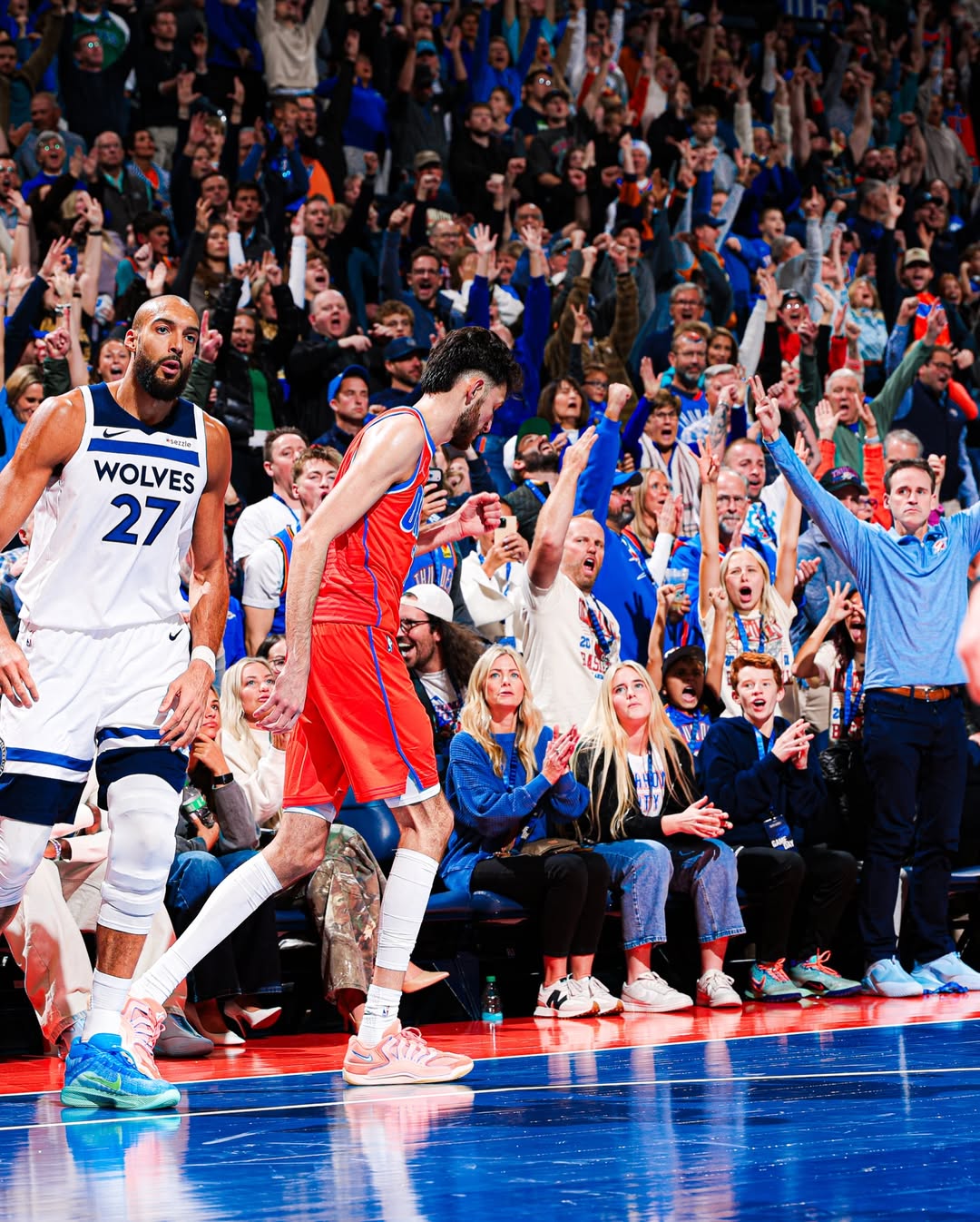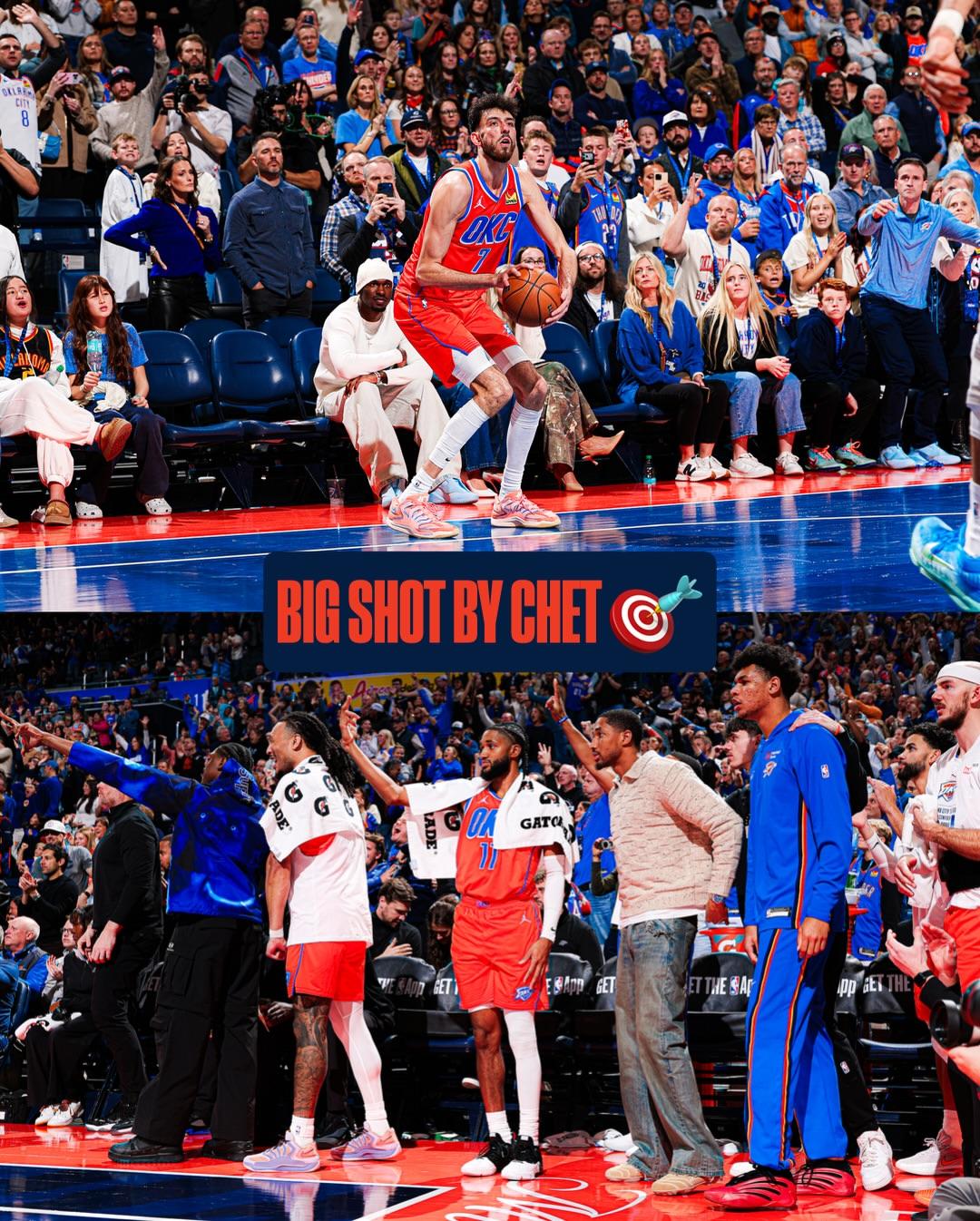 雷霆ins报道。切特·霍姆格伦的表现让俄克拉荷马城雷霆队主场球馆@paycomcenter的全体观众起立欢呼