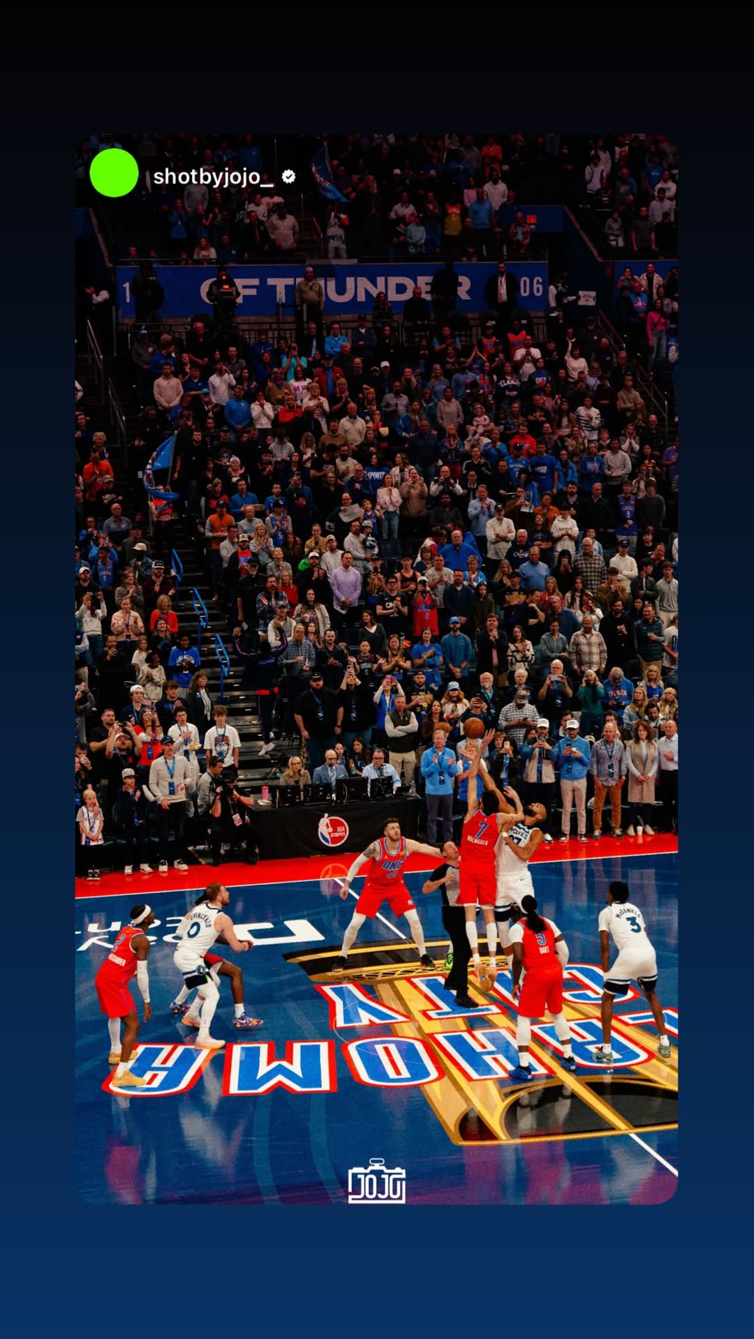 虎扑11月27日讯雷霆球员切特-霍姆格伦更新个人社媒,晒出今日比赛开场跳球照片。