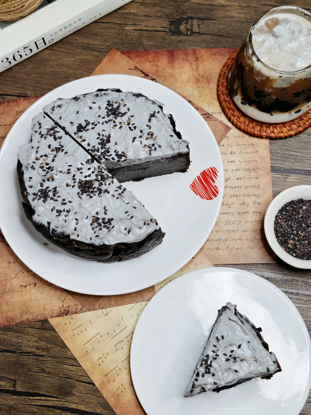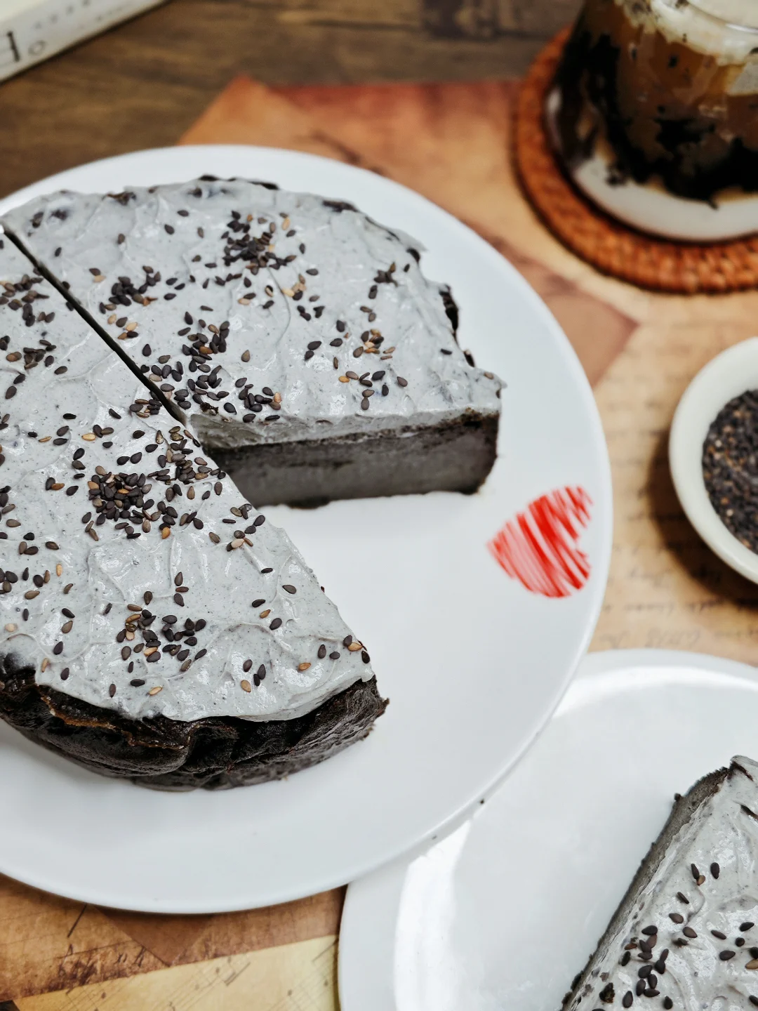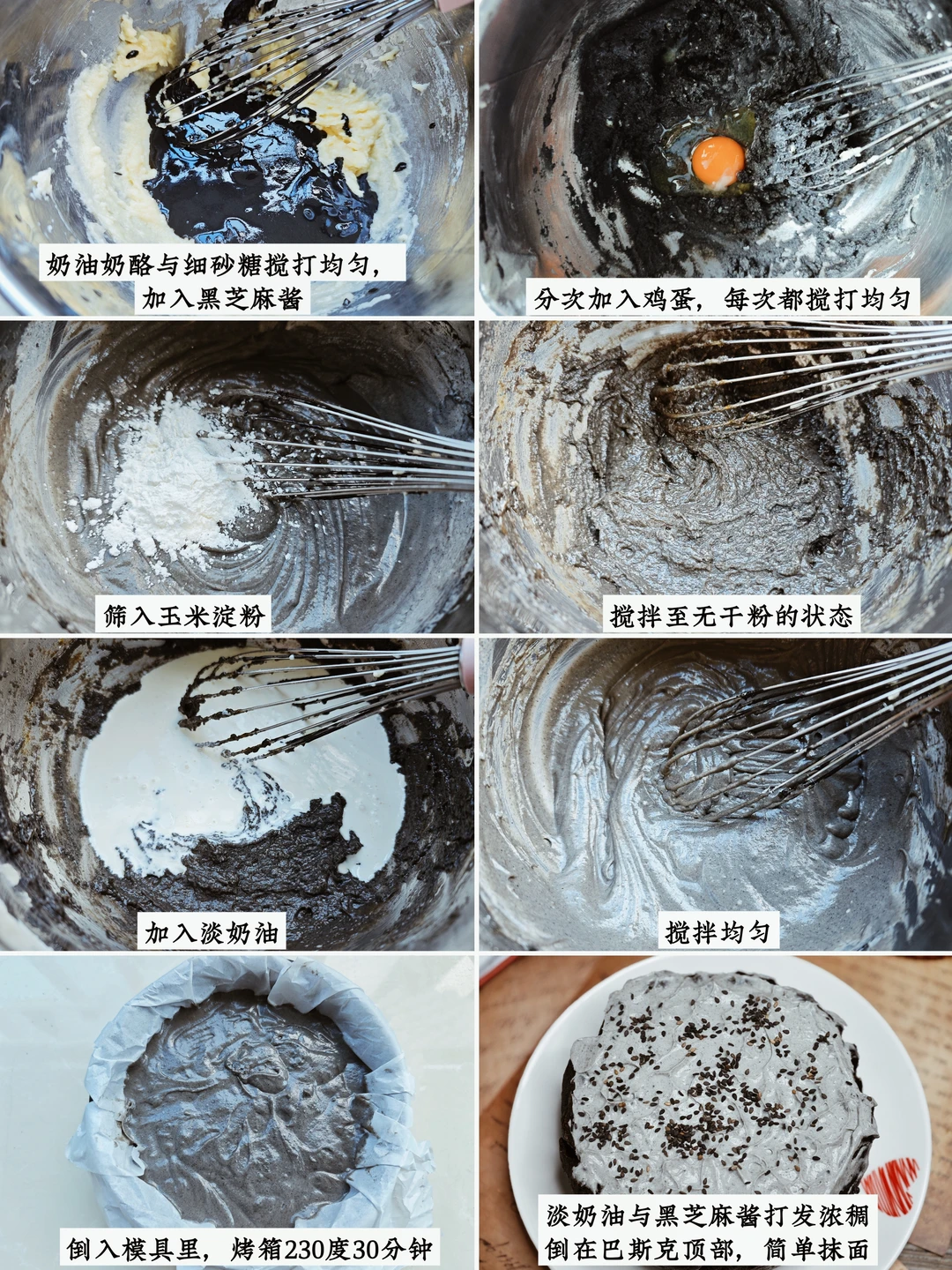 5⃣️淡奶油与白砂糖打发浓稠,倒入黑芝麻酱,打发至有纹路的状态,涂抹在黑芝麻巴斯克上,撒上黑芝麻装饰,就可以直接切块食用[害羞R]