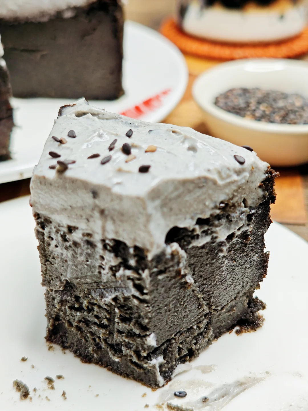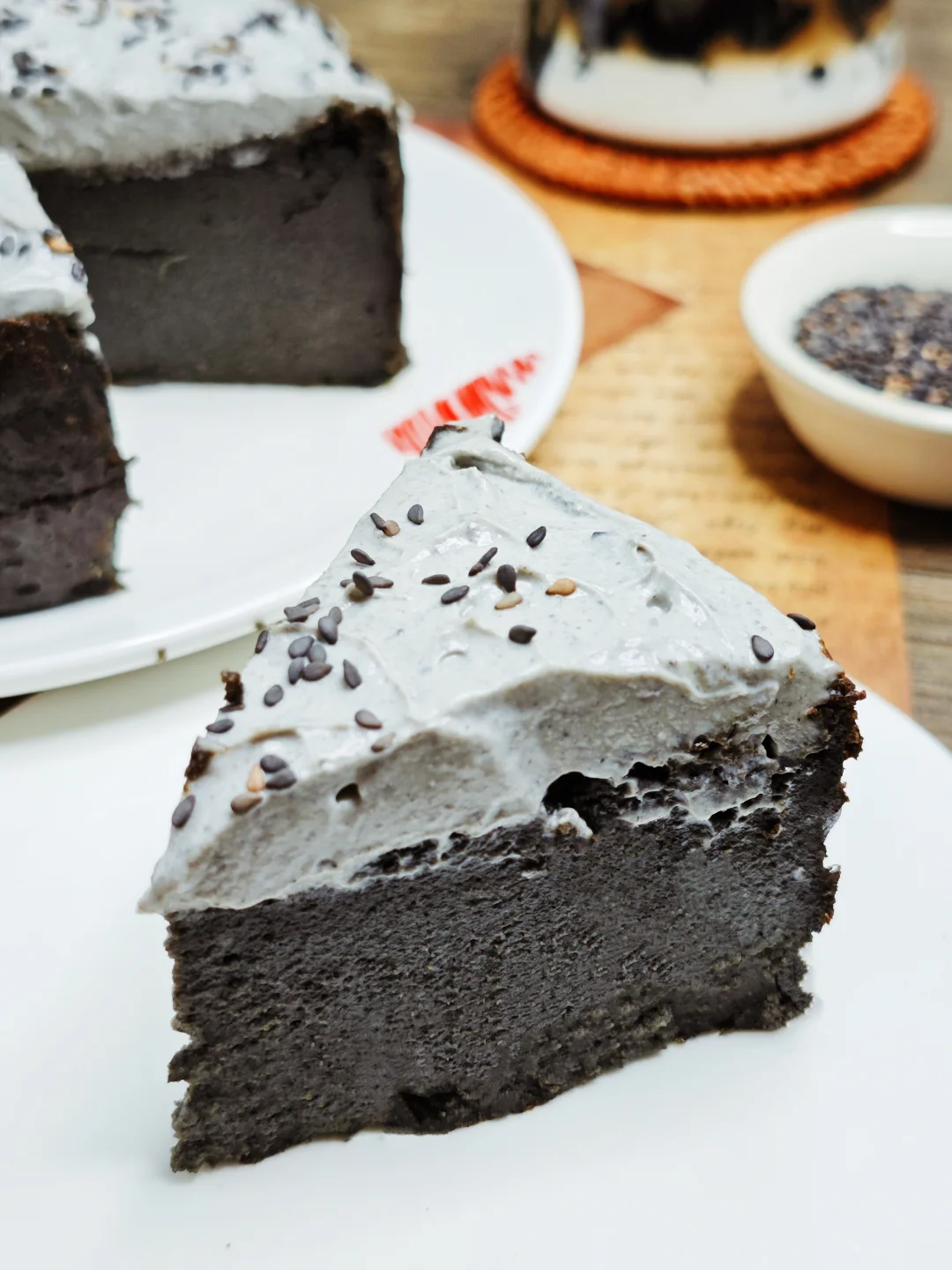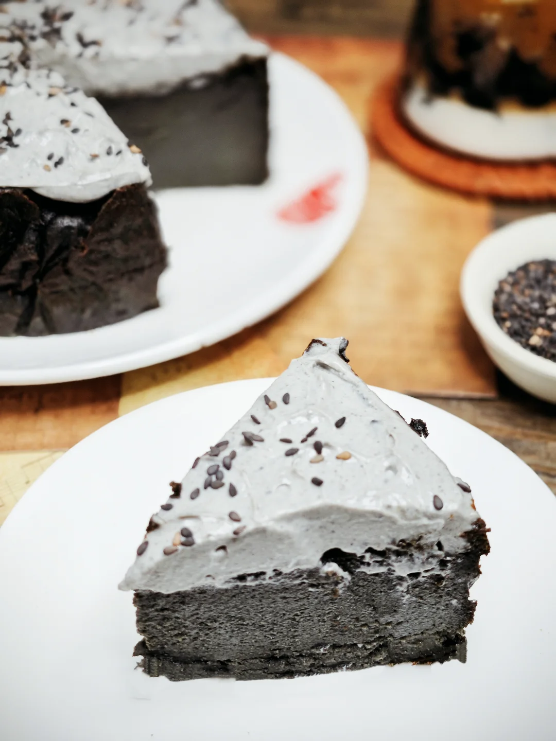5⃣️淡奶油与白砂糖打发浓稠,倒入黑芝麻酱,打发至有纹路的状态,涂抹在黑芝麻巴斯克上,撒上黑芝麻装饰,就可以直接切块食用[害羞R]