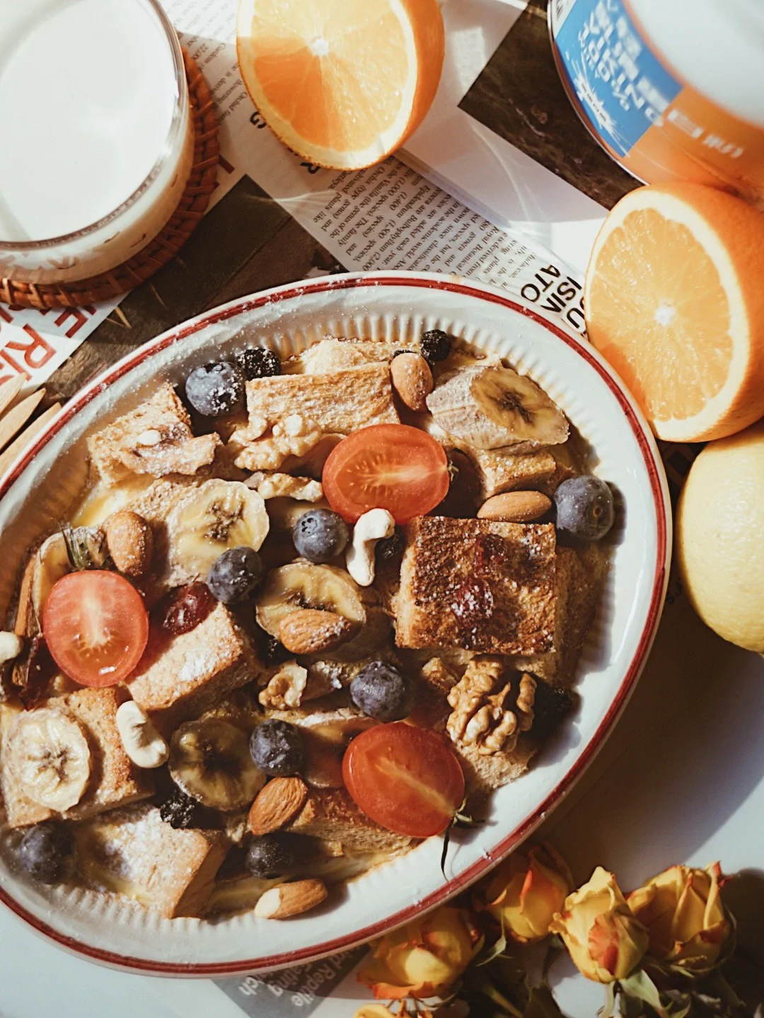 香喷喷的全麦吐司🍞烘蛋经过烤箱的高温烘烤,乳清蛋白粉里的椰奶香气,扑鼻而来。上面撒上了我爱吃的蓝莓、圣女果和各种坚果。