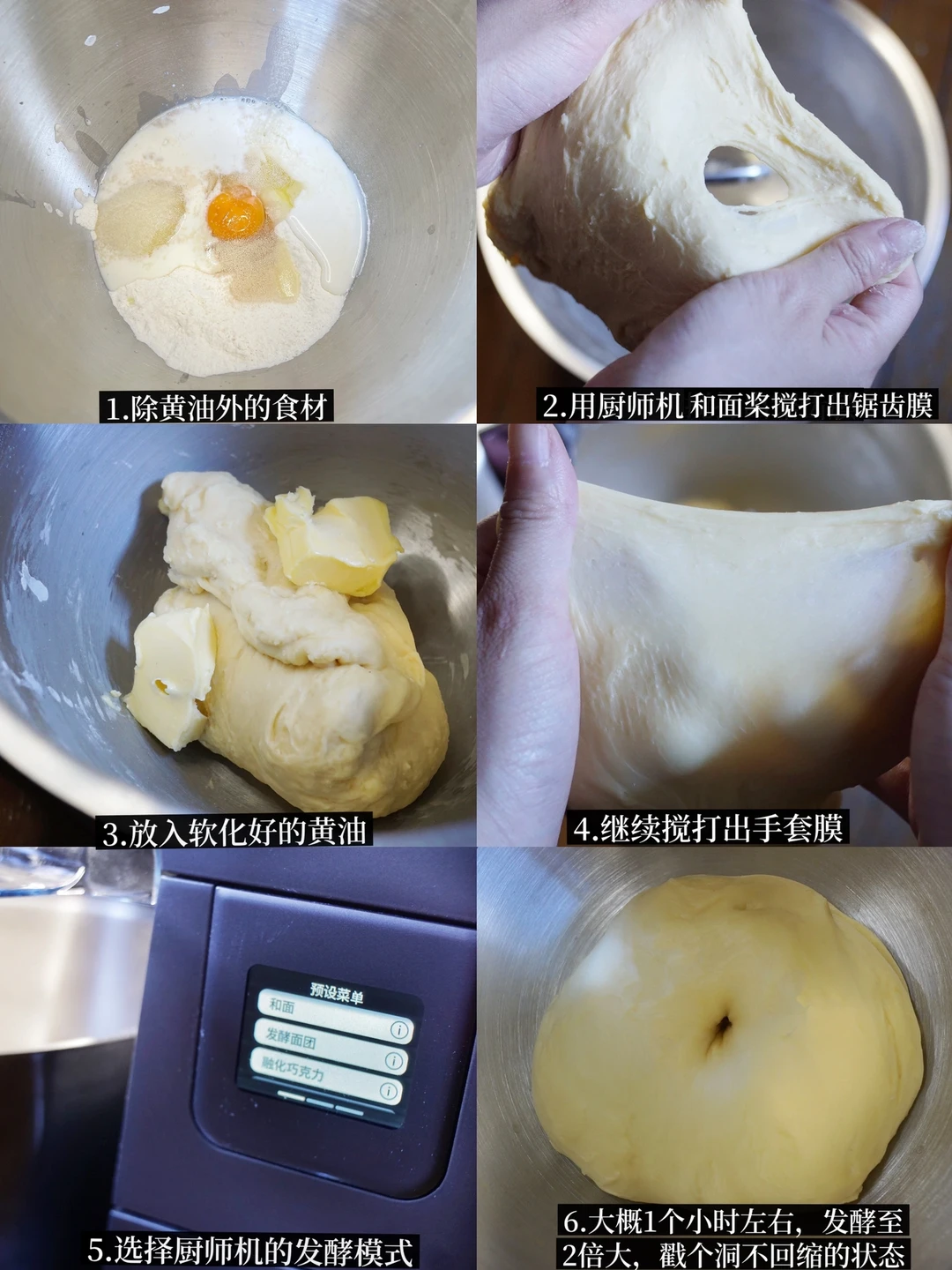 3️⃣把面团放进7L搅拌碗内,厨师机选择发酵模式,时间在1个小时左右,面团发酵至2倍大左右,戳个洞不回缩。拍一拍面团排气,分割成6份。揉圆松弛30分钟