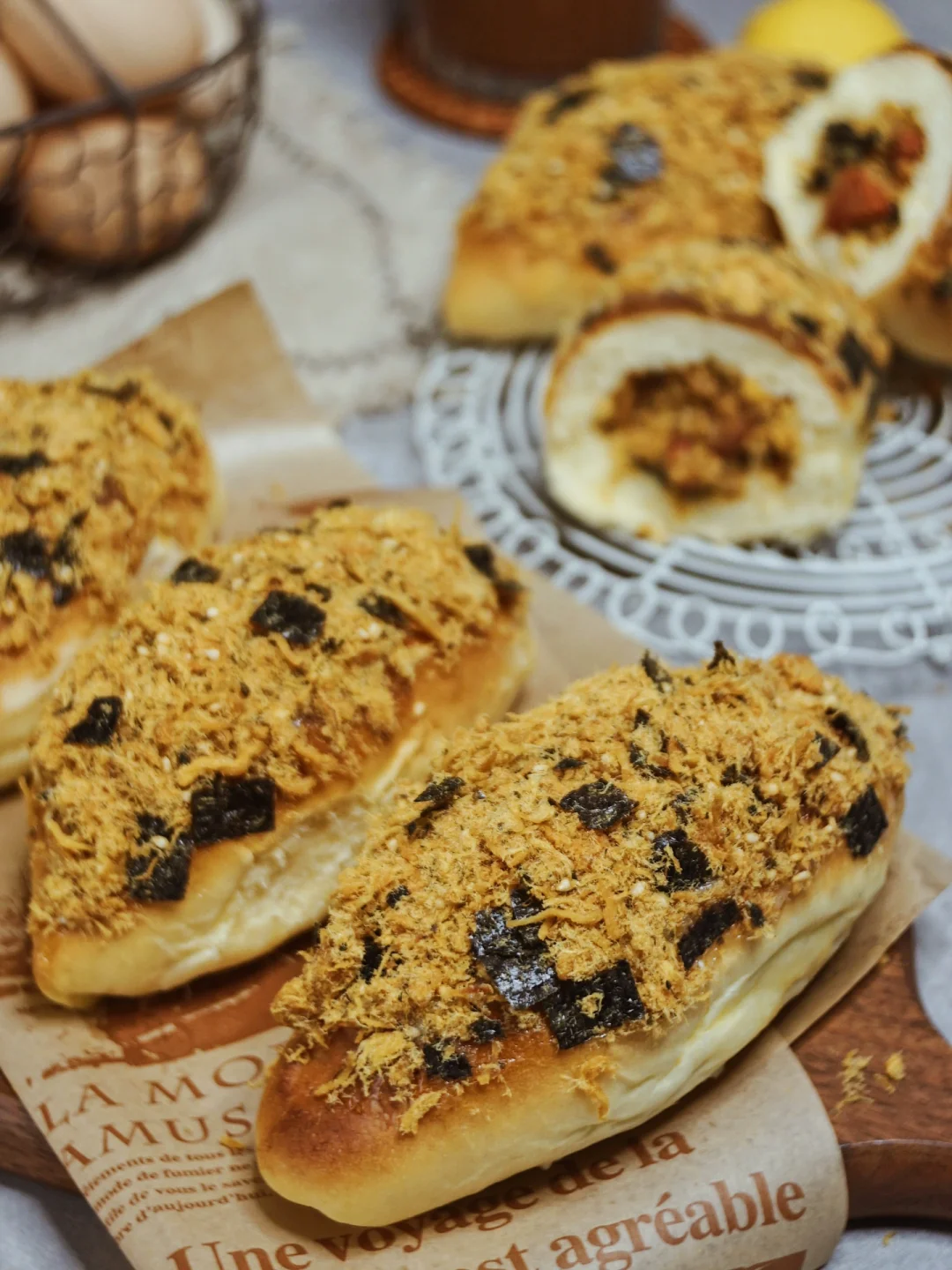7️⃣烤好的面包,表面抹上一层奶酪沙拉酱,再撒上海苔肉松!!!