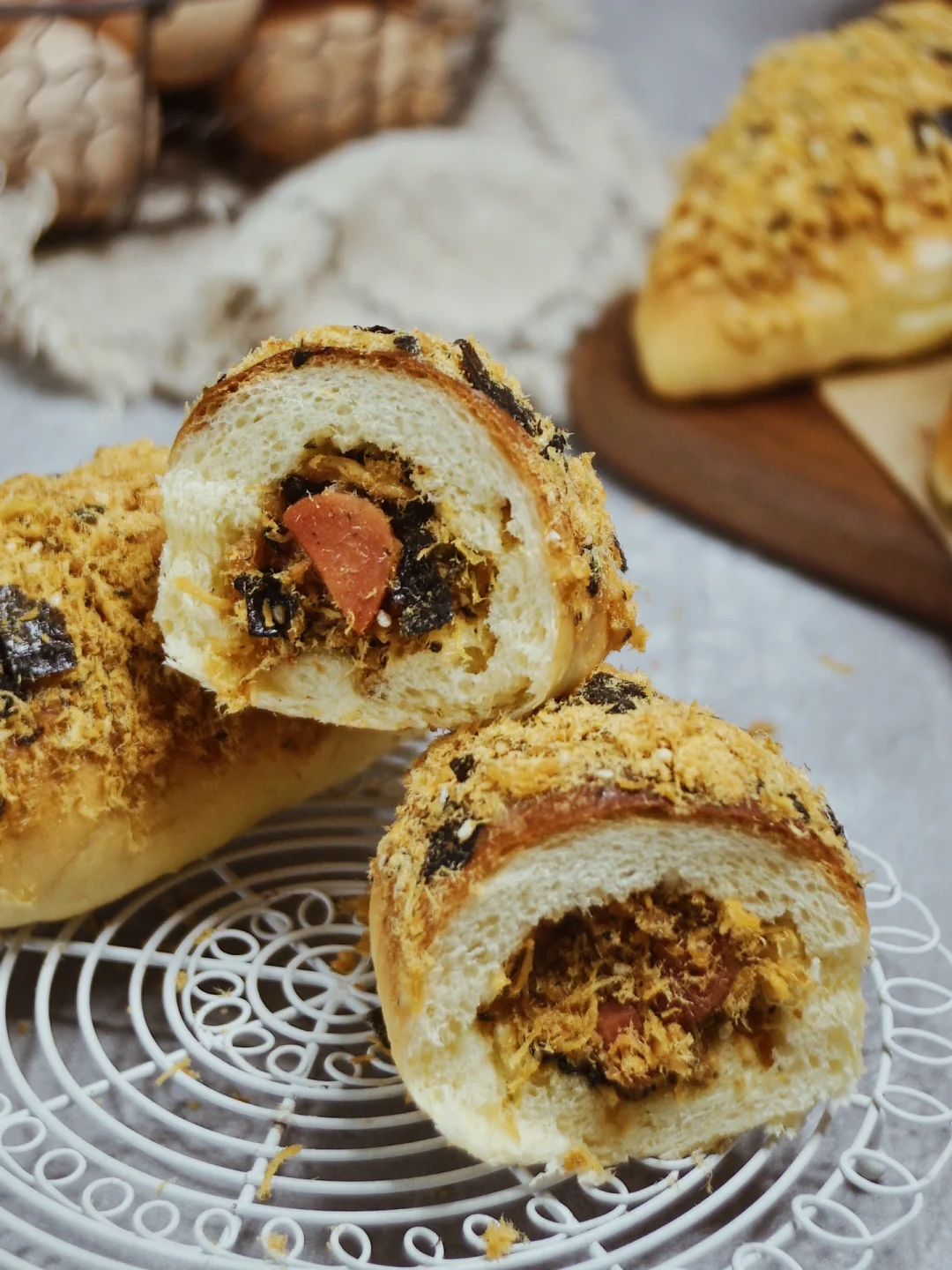 做出来的海苔肉松面包🌭不仅外面都裹满了肉松,里面还有肉松火腿的夹心🥓炒鸡满足。