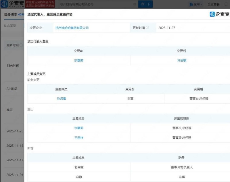 企查查APP显示,近日,杭州娃哈哈集团有限公司发生工商变更,宗馥莉卸任法定代表人、董事长、总经理职务,由许思敏接任,同时,多位主要人员发生变更。