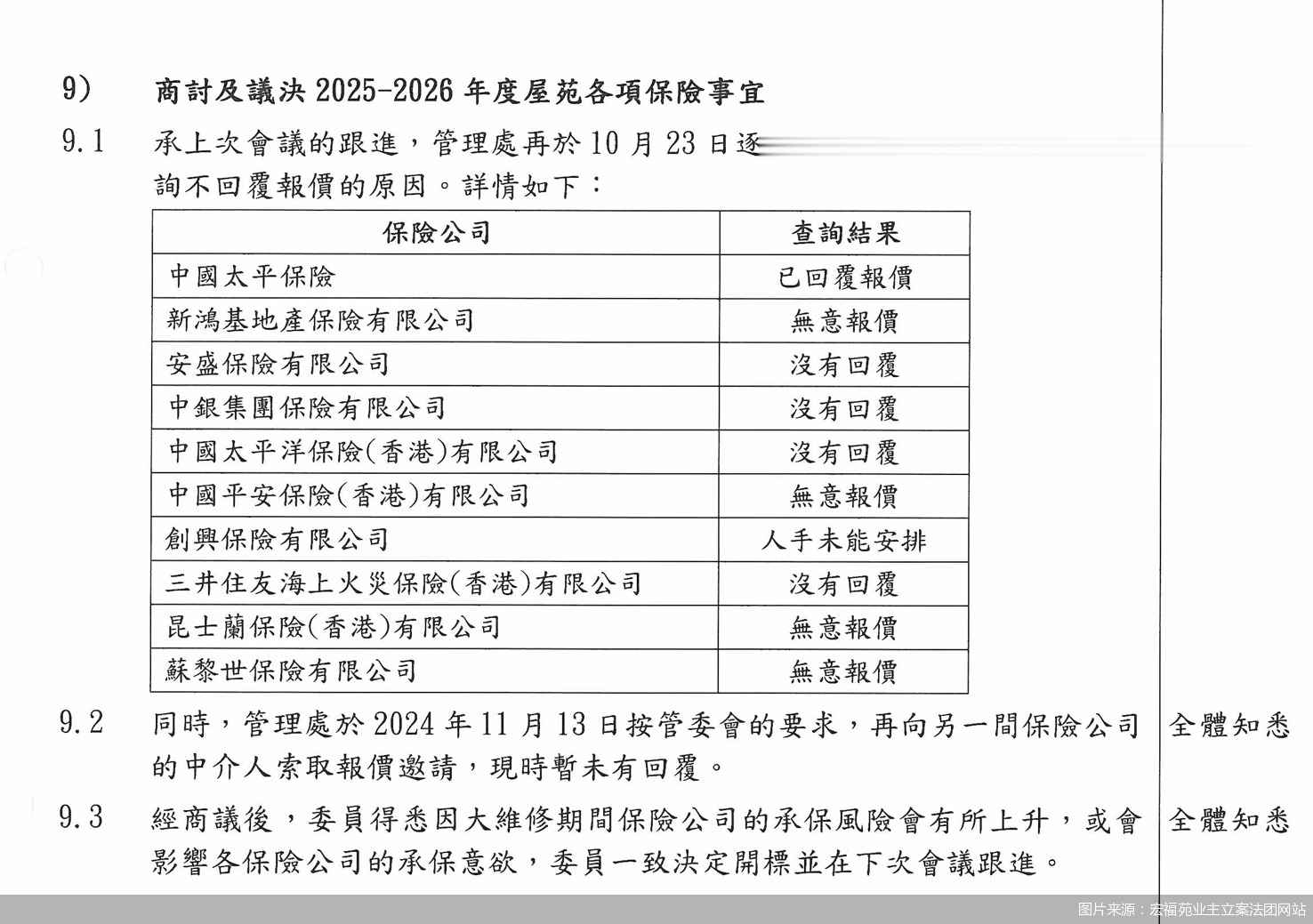不过,在此前会议记录提到,宏福苑业主立案法团商讨房屋保险事宜中,向10家保险公司索取报价邀请,在截止后只收到“中国太平”回复报价及“新鸿基保险”回复不报价。其余保险公司对于宏福苑的保险无意报价或没有回复、人手未能安排。会议记录提到,委员得悉因大维修期间保险公司的承保风险会有所上升,或会影响各保险公司的承保意愿。