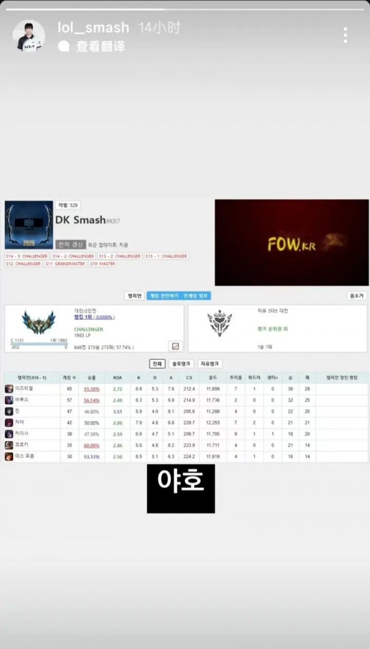准备在DK证明自己了?DK.Smash登顶韩服后更新社媒动态:呀呼