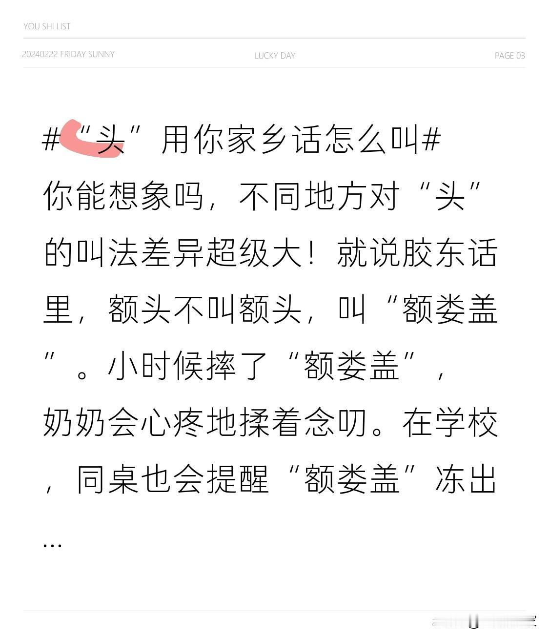 你能想象吗,不同地方对“头”的叫法差异超级大!就说胶东话里,额头不叫额头,叫“额娄盖”。小时候摔了“额娄盖”,奶奶会心疼地揉着念叨。在学校,同桌也会提醒“额娄盖”冻出小红点。上海方言里“头”出现频率超高,用法也五花八门,像“红头阿三”“垫刀头”“榔头”等,“榔头”还分动词和名词说法。 真好奇大家家乡话里“头”是怎么叫的,快在评论区分享,让我们感受更多方言魅力!家乡话里的头 方言大揭秘 头的不同叫法 家乡称呼 叫什么叫梗 农村奇葩叫法 头字词解释 老话头 头字词解释 头 抬额头 头为什么尖尖的 鏟头 鎚头 潮汕头