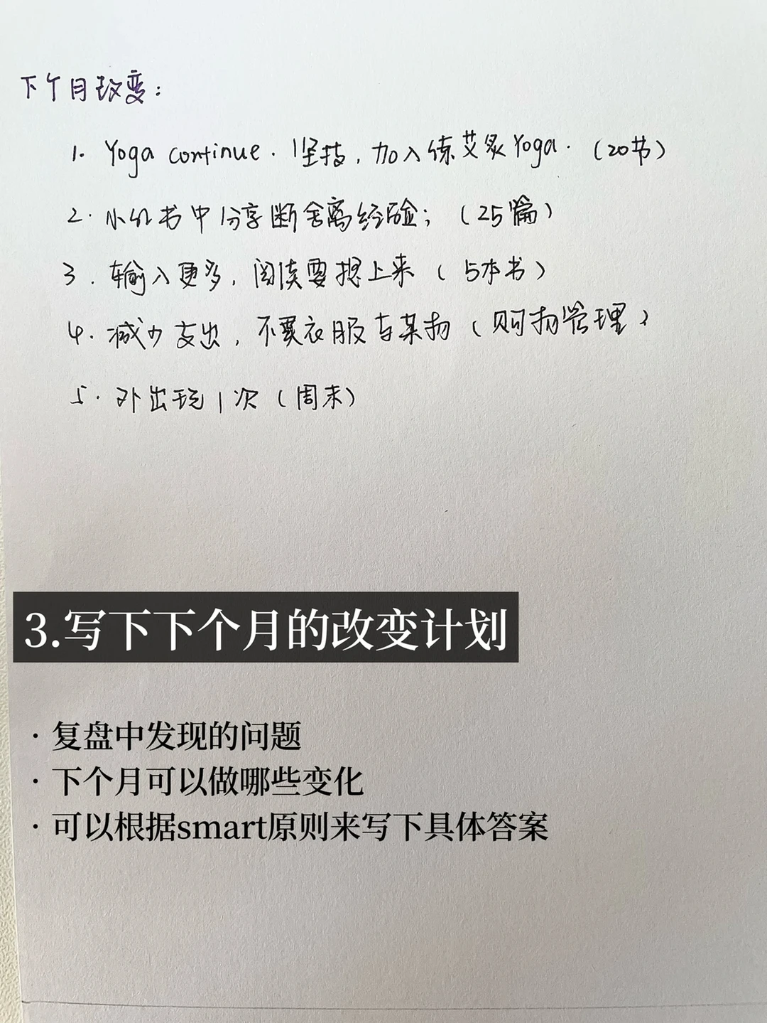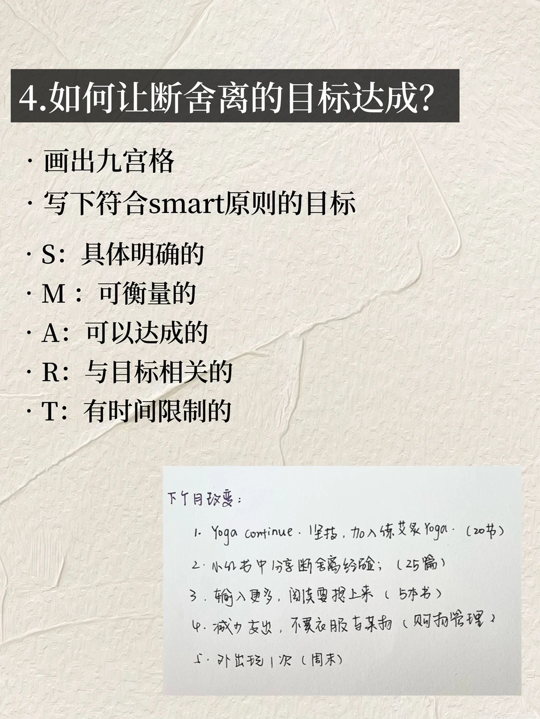 根据复盘的问题,用smart原则来书写下个月想达到的目标。10分钟的断舍离复盘就完成了。如果想更快速一点,直接用smart原则来完成九宫格,5分钟搞定。