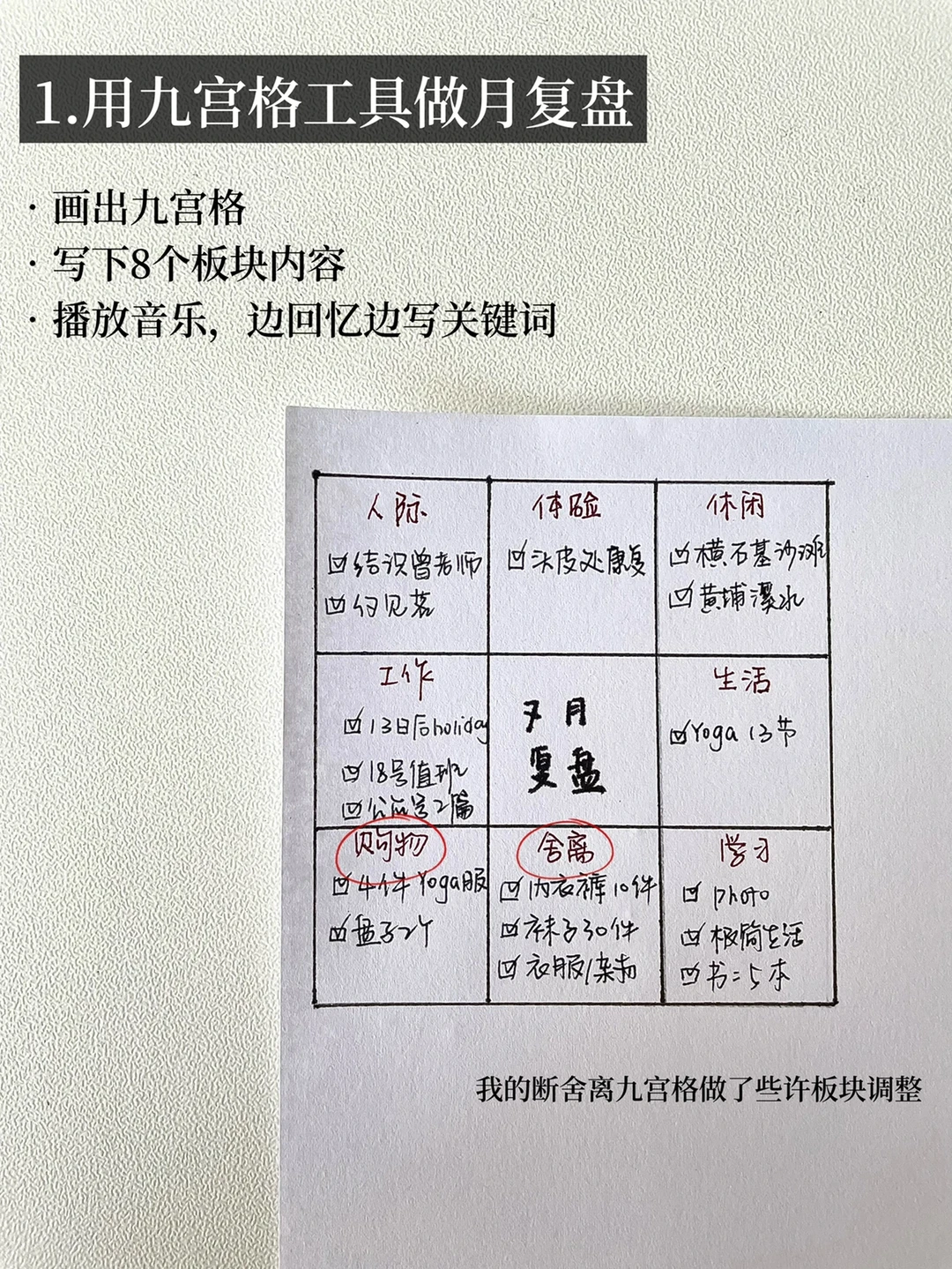 step2:中间写下“7月复盘”,剩余八个格子分别写上:人际|工作|生活|休闲|体验|勾物|舍离|学夕。可以用不同颜色的笔写。