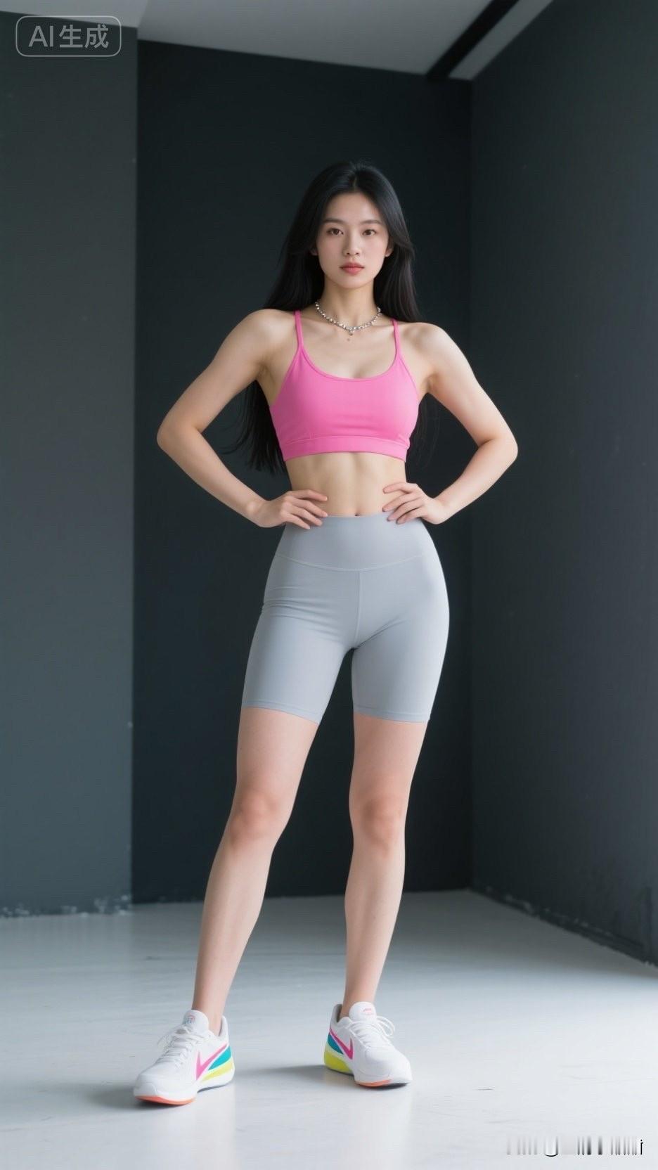 她这身是当下流行的“运动甜酷活力风”穿搭:玫粉运动内衣+浅灰紧身短裤,搭配彩虹元素鞋袜与银色项链,适配健身场景,是现在很火的“亮色单品+细节点缀”思路,既靠高饱和粉衬出元气氛围,又以修身版型显利落线条,自带活力又吸睛的运动气质。