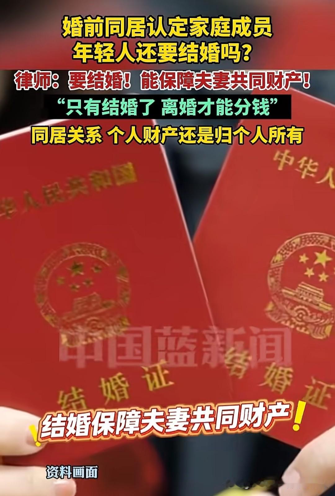 原来结婚就是为了以后能分钱?对,但也不全对。如果婚姻感情出现裂痕,到了离婚的地步,这个时候结婚证就发挥它的最大的价值了,哪些是你的,哪些不是你的,法律会给你一个公正公平的判决。 如果不结婚,只是同居,虽然这种同居关系也是认可对方是家庭成员的,但个人财产是不受法律保护的。也就是说两人同居后所有的开销,都是自愿出的,所有的财物是谁的就是谁的,如果是赠送就是对方的,如果是共用的就看谁用的次数多,谁更有理了。 当然,同居分不到债,离婚是能分到债的。所以婚姻法只保护财产,不保障感情。婚前同居认定家庭成员,这一认定的核心是保护亲密关系中弱势群体的权益,填补此前因“无结婚证”导致的家暴维权空白。