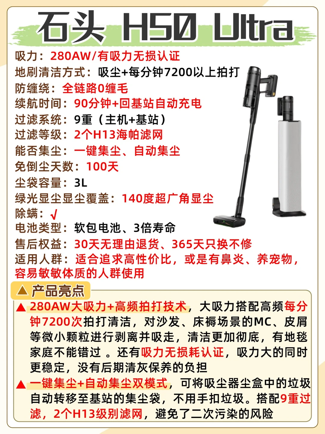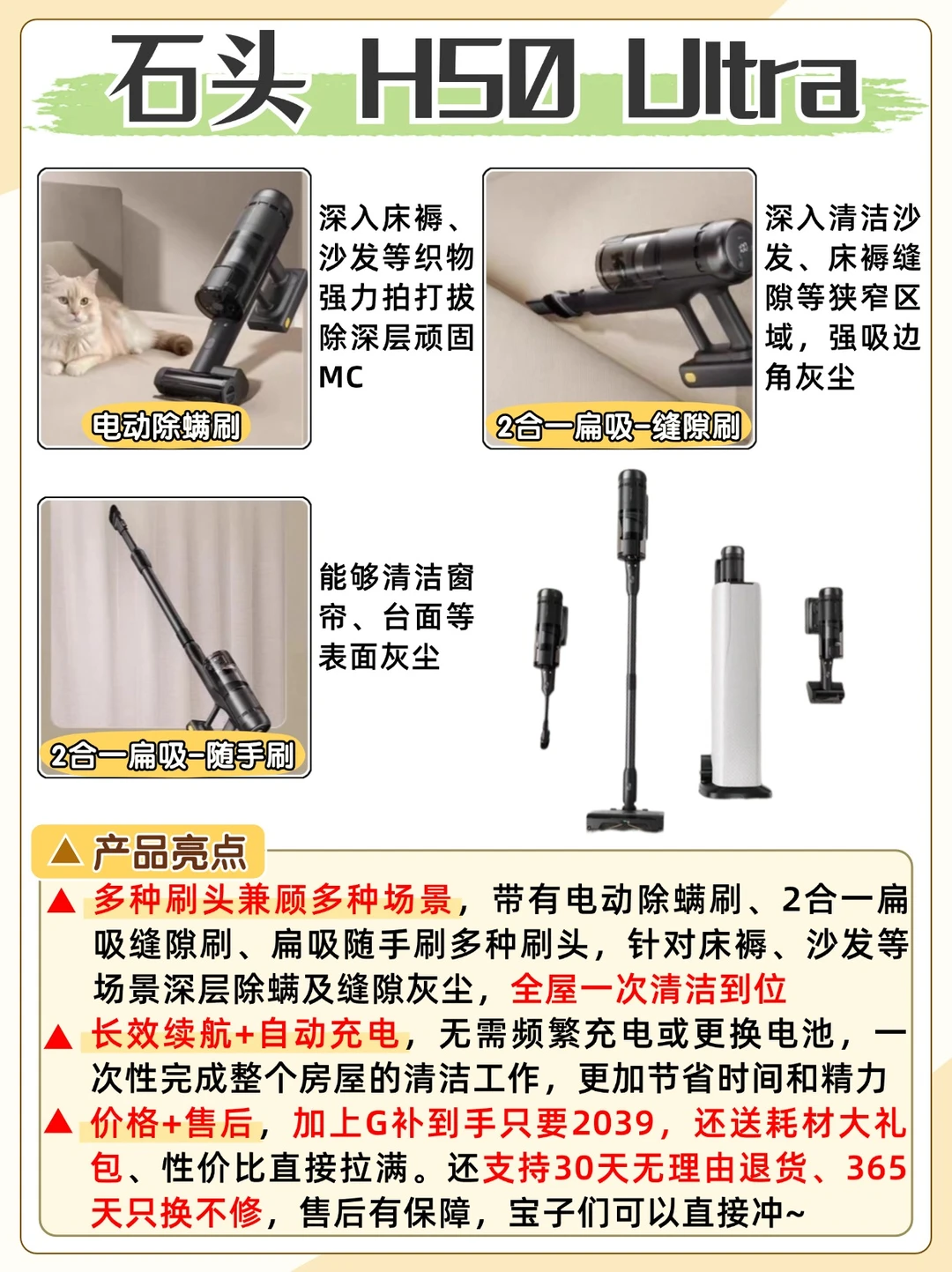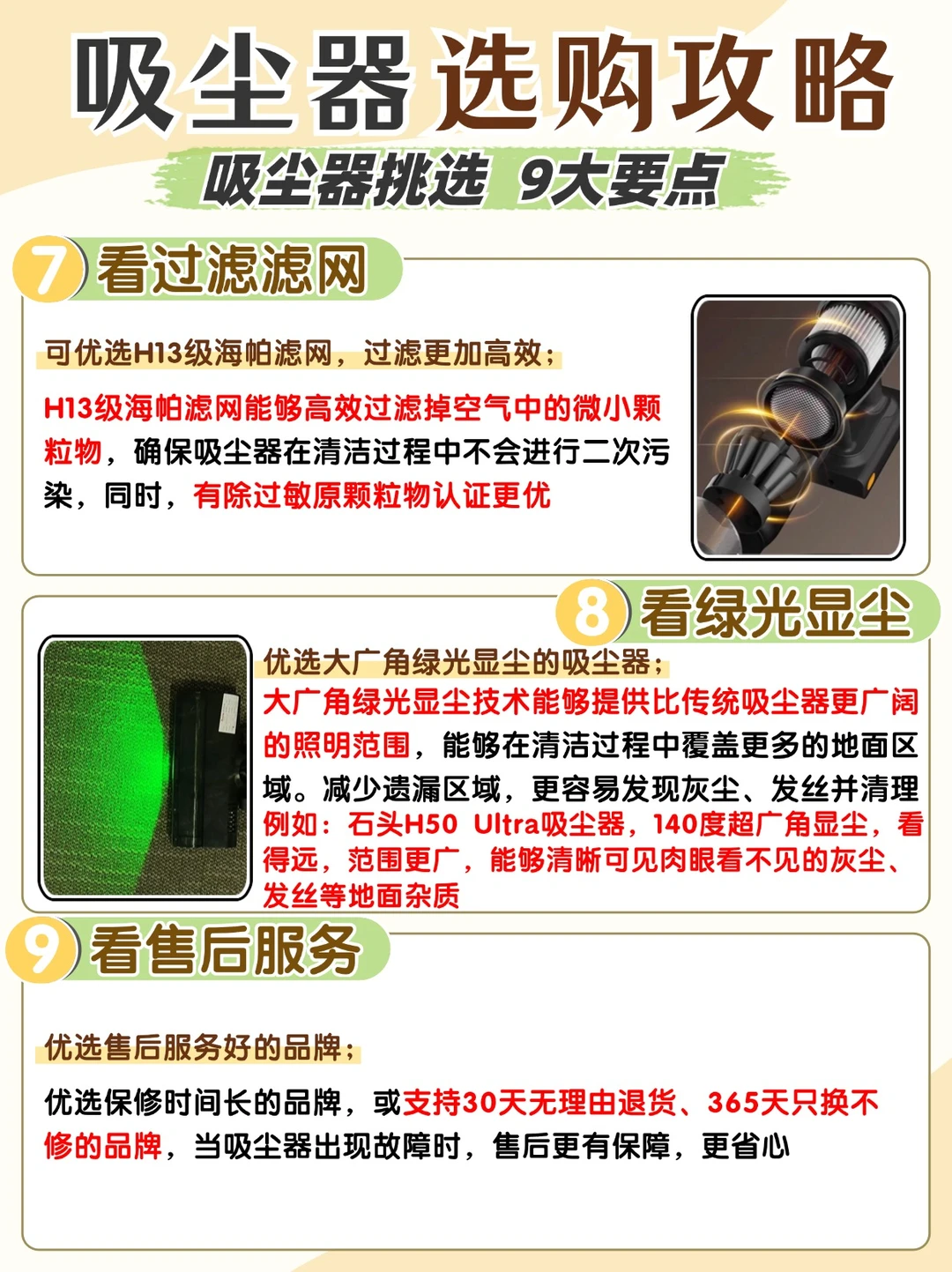 优选保修时间长的品牌,或支持30天无理由退货、365天只换不修的品牌,当吸尘器出现故障时,售后更有保障,更省心