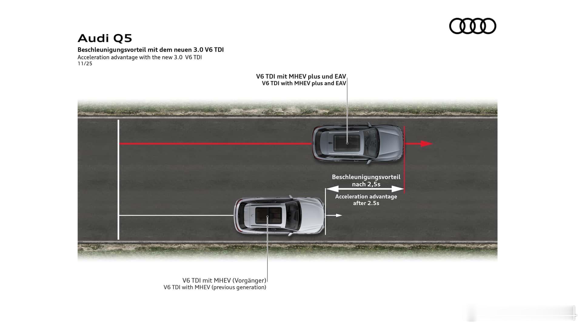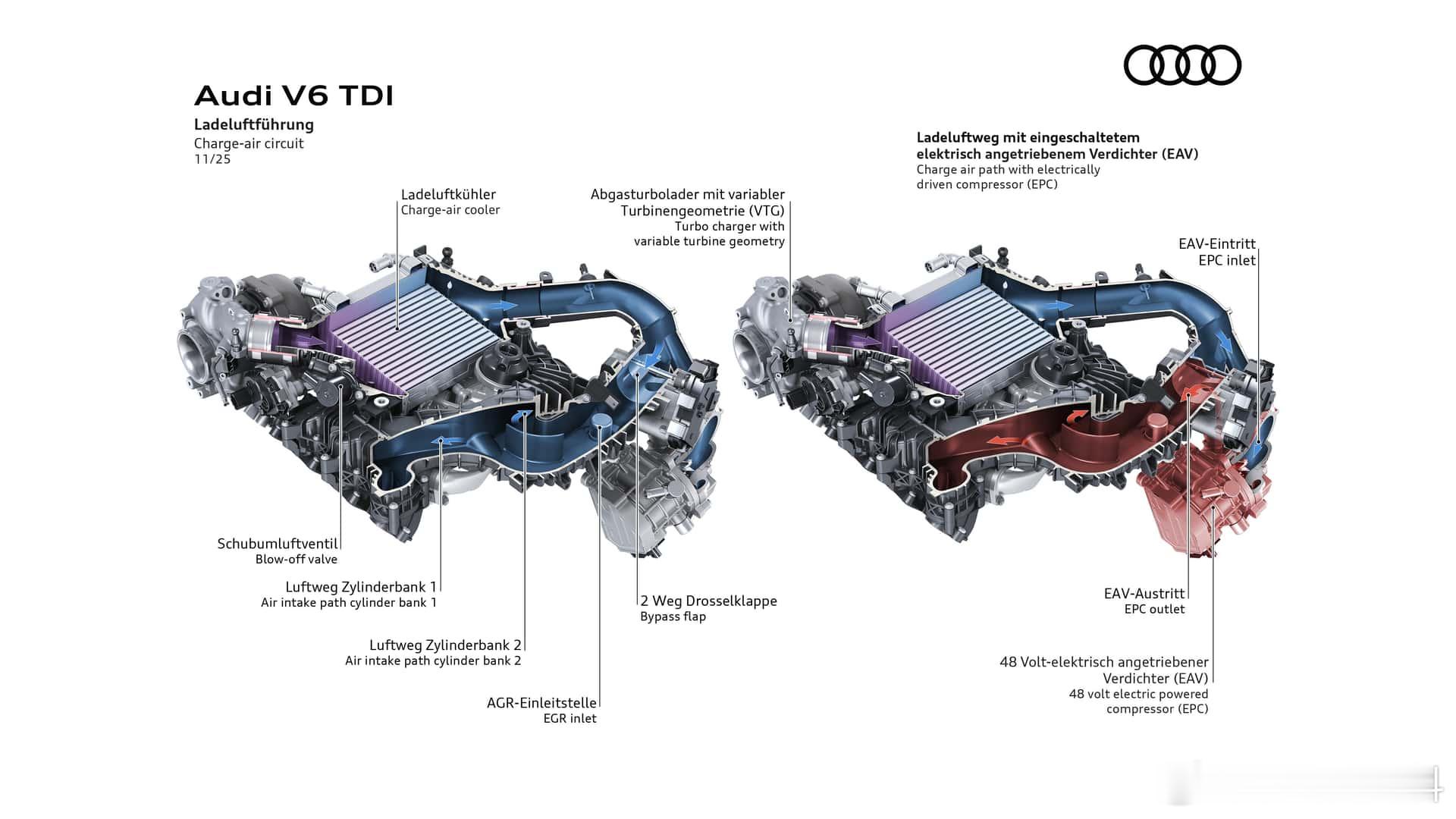 零延迟?能烧食用油?奥迪新一代TDI引擎有多牛?尽管欧盟对燃油车排放法规大幅收紧,导致柴油车份额从50%的历史巅峰骤降至如今前十个月的8%,连PHEV都干不过,但奥迪没打算淘汰TDI今年换代的奥迪A6和Q5,均搭载了一款电气化的3.0TDI V6发动机(EA897evo4),通过融合电动压缩机和轻混系统,进一步提升能效水平当你油门踩到底,涡轮增压没跟上的时候,进气会被引导到电动压缩机,完成彻底的压缩并送入燃烧室,从而在低转速获得更大的扭矩,以至于消除了涡轮迟滞,奥迪表示响应性能甚至“可媲美同功率电车”输出方面,最大功率295马力/3620rpm,峰值扭矩580N·m/1500rpm,达成最大增压压力(3.6Bar)用时快了仅1s,压缩机轮速快了40%,达到90000rpm仅需250ms,起步响应快到开始的2.5s能领先一个车身此时轻混系统也能额外输出24马力、230N·m,从而让A6柴油版零百仅需5.2s,旅行版也有5.3s,Q5甚至还更快,5s内破百除此之外,奥迪表示该引擎耐用性和燃油效率均有提升,有着迄今为止最清洁的排放,甚至可以使用地沟油+农业副产物制成的氢化植物油HVO,从而降低95%的二氧化碳排放SUV大百科 大v聊车 柴油机