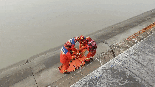 根据现场情况,几名消防员迅速携带担架,来到堤坝下方,小心将工人抬上担架,并用固定带做好防护。经过相互配合,消防员们成功将工人转移至岸上,并送往医院救治。