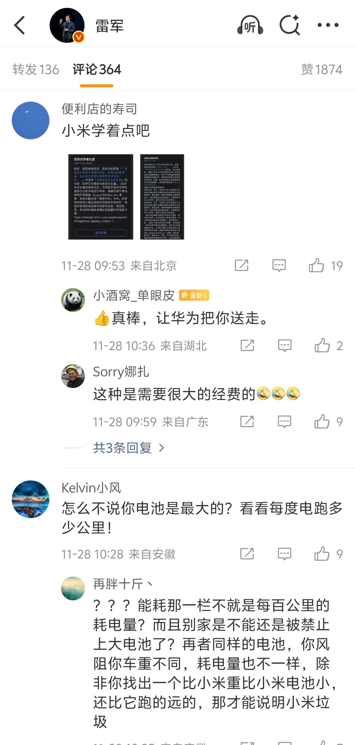 雷军回应小米汽车续航测试 感觉最近雷总发啥,评论区都....