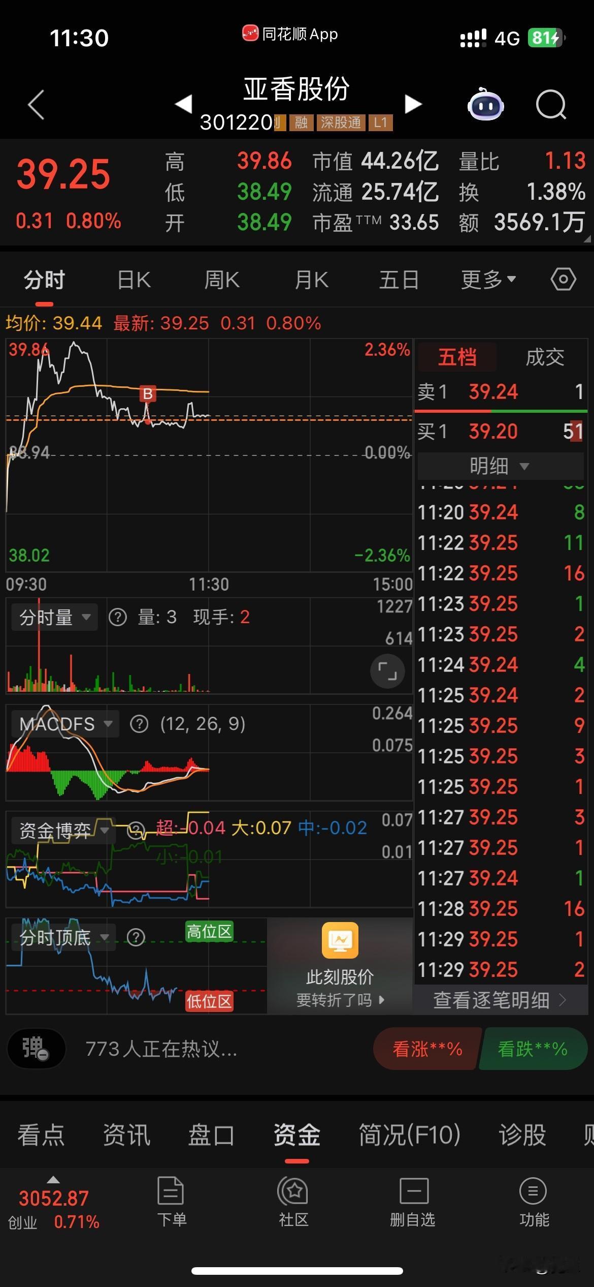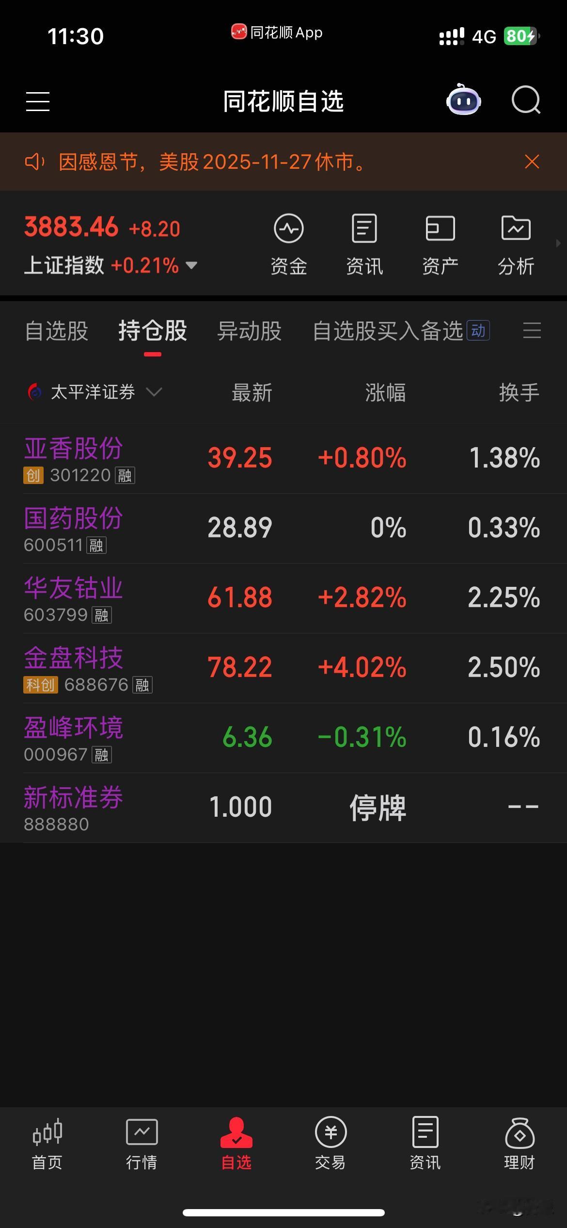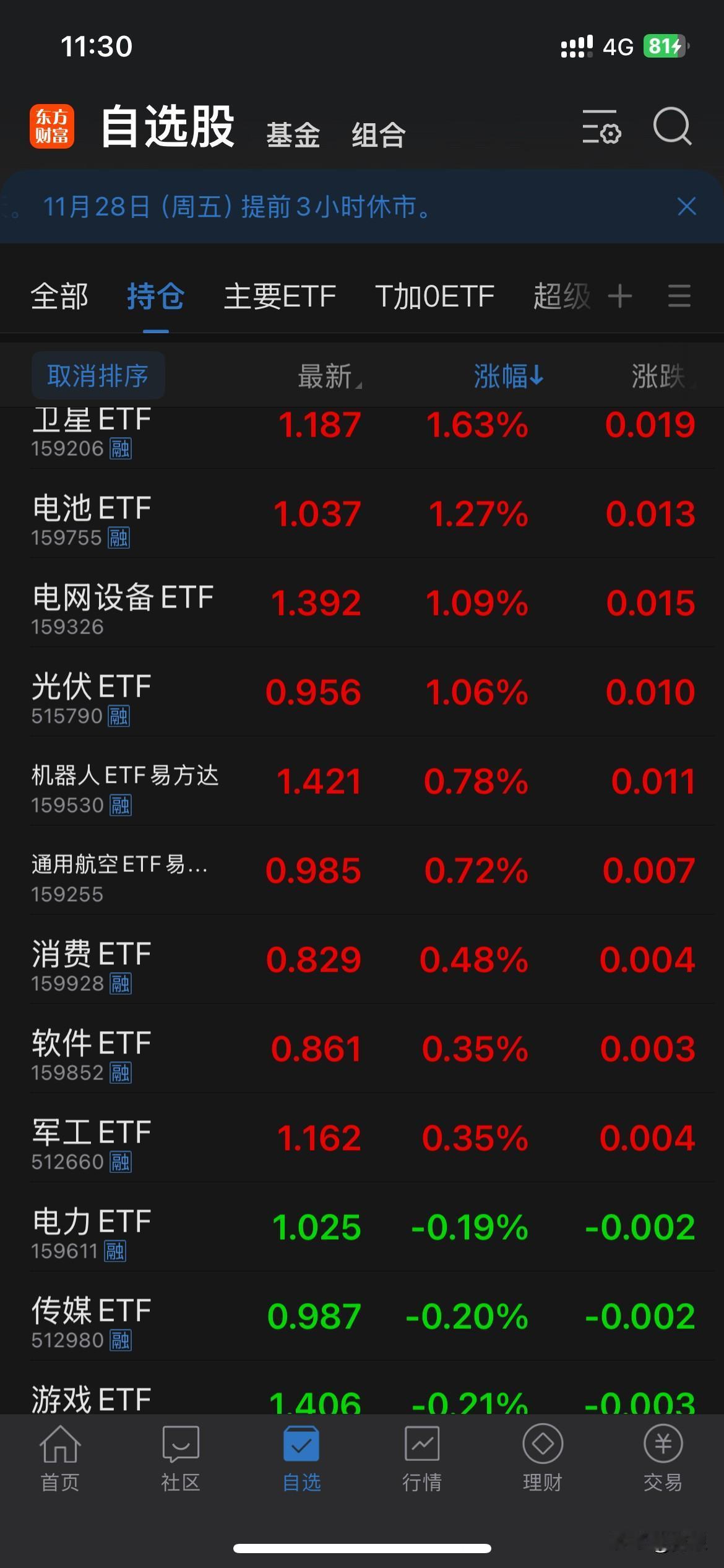 上午收盘了,早盘大盘蛮吓人的低冲,估计又又不少人割肉跑路了。也吓着我了,赶紧抛了华友,想等跌下来做T,但今天华友异常强势,不得已追高少买了一点,做了个反T,失败啊🤔。亚香我跟踪一段时间了,今天决定趁回调介入。看好它后面走出来。金盘今天先弱后强,跟着海南概念走。持股不动。如果下午华友回落,再补一点,涨上去就不买了。 盈峰早盘埋了6.3买2千股的单子。上午赚了一点,下午如果大盘不跳水,本月红盘跑不了了。另外贴一张我东财持有的ETF。下午继续战斗[呲牙]