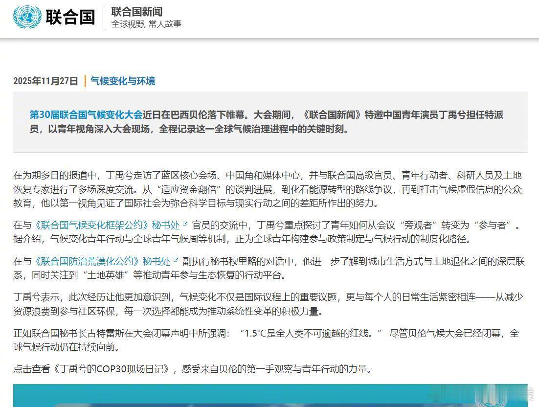 丁禹兮登上联合国新闻版头 联合国官网版头大固屏+COP30现场日记vlog,带着