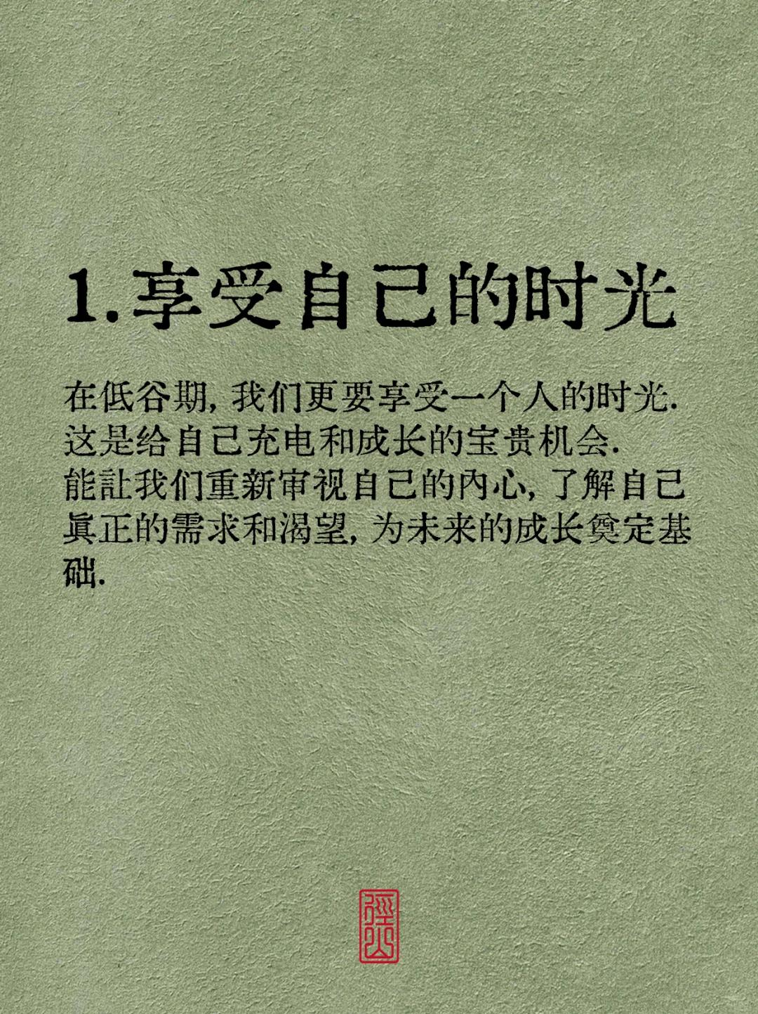 遇到工作低谷期 其实是在保护你 ✨低谷期,是挑战也是机遇 🍃在人生的低谷期,我们被迫停下匆忙的脚步,开始深刻反思自己,同时可以做一些有意义的事情。 🔹这是一个难得的自我审视的时刻🔹 让我们有机会重新评估自己的人生目标。同时,低谷也让我们清晰地看到自己的不足。认识到这些不足,我们才能有针对性地学习和提升,为未来的成功积累资本。