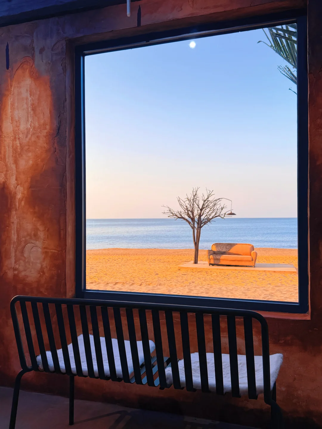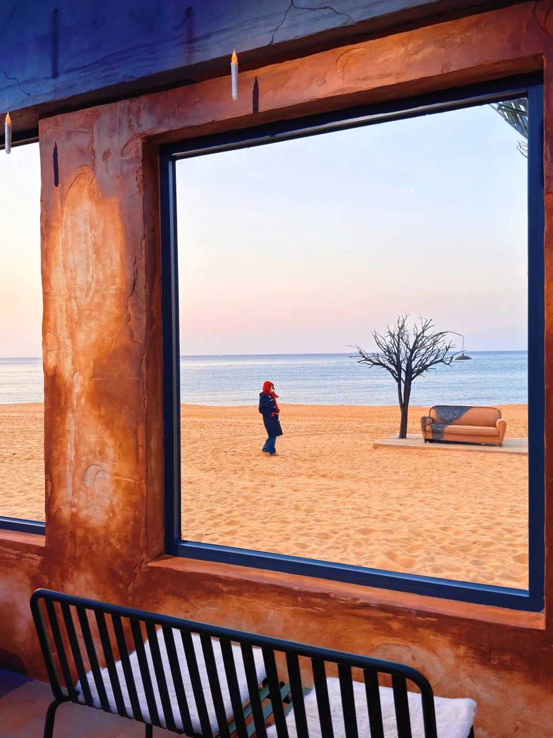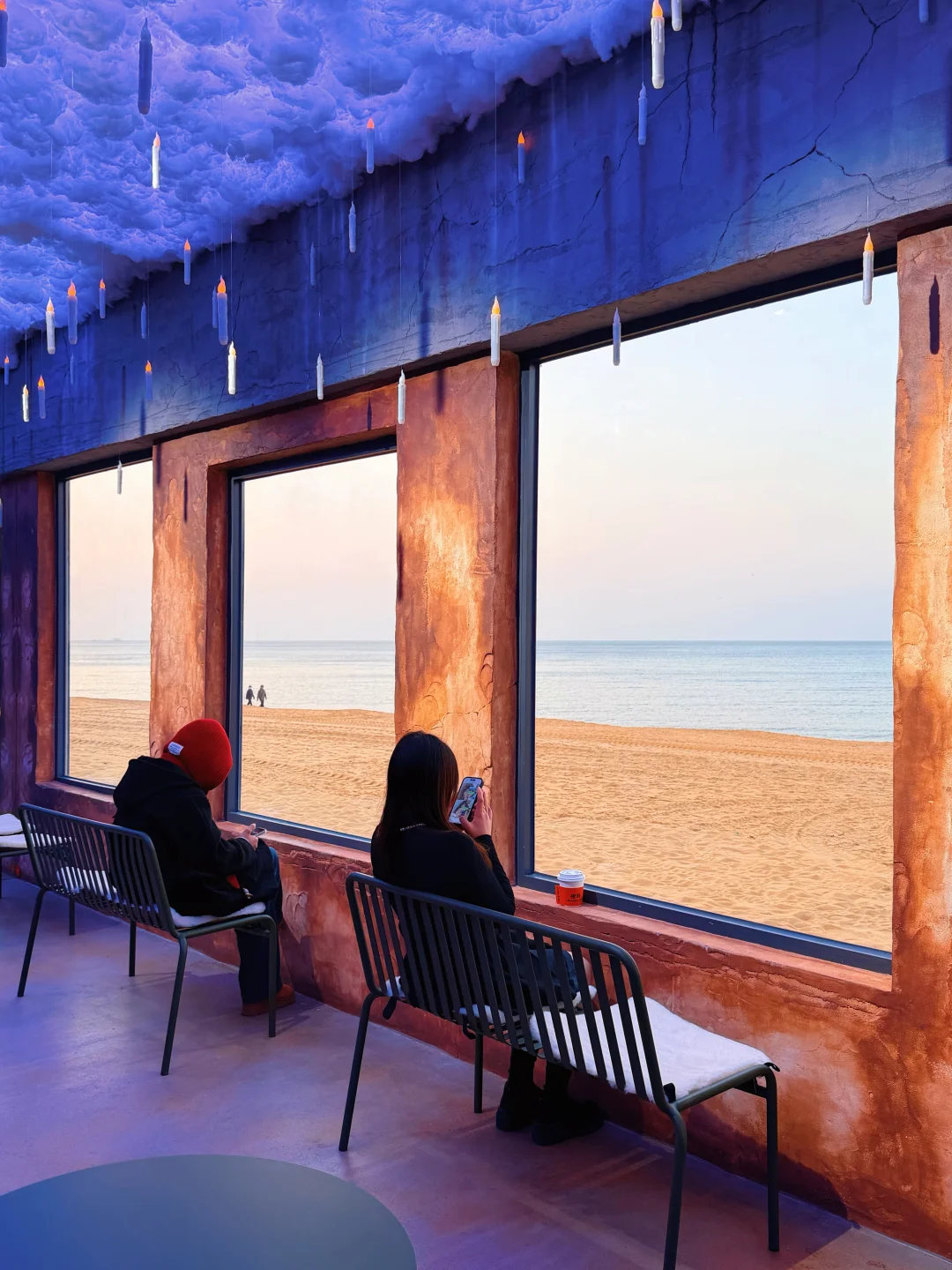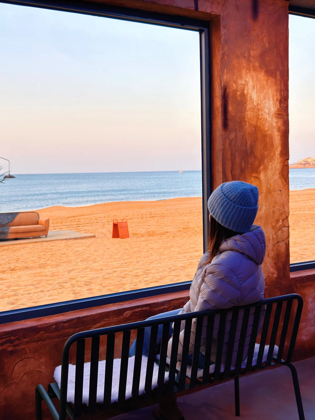 位置就在国际海水浴场,来看日落的姐妹一定不要错过这里,面朝大海的窗户一秒框进油画🖼️里,真的不敢想象下雪🌨️的海边,在这里拍照能有多出片!