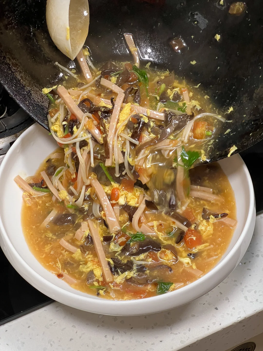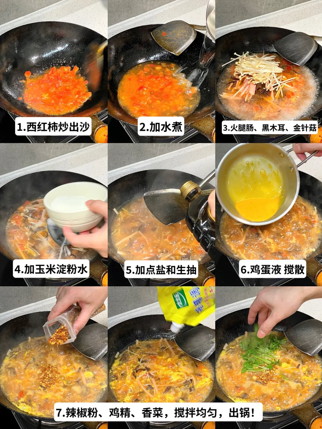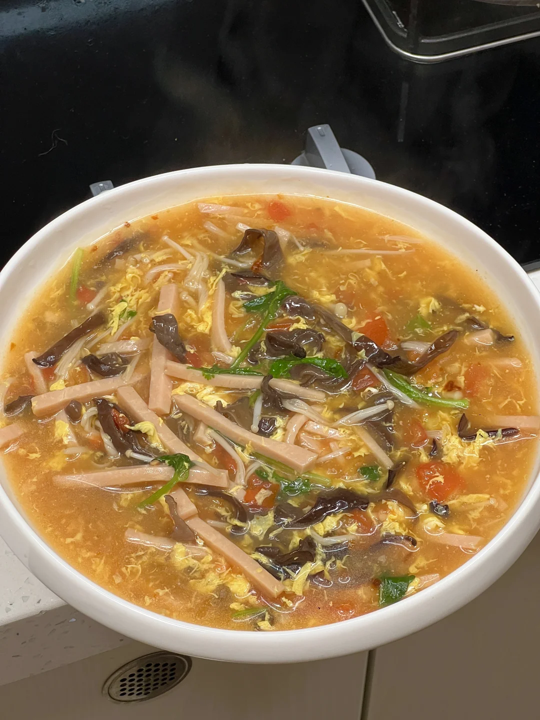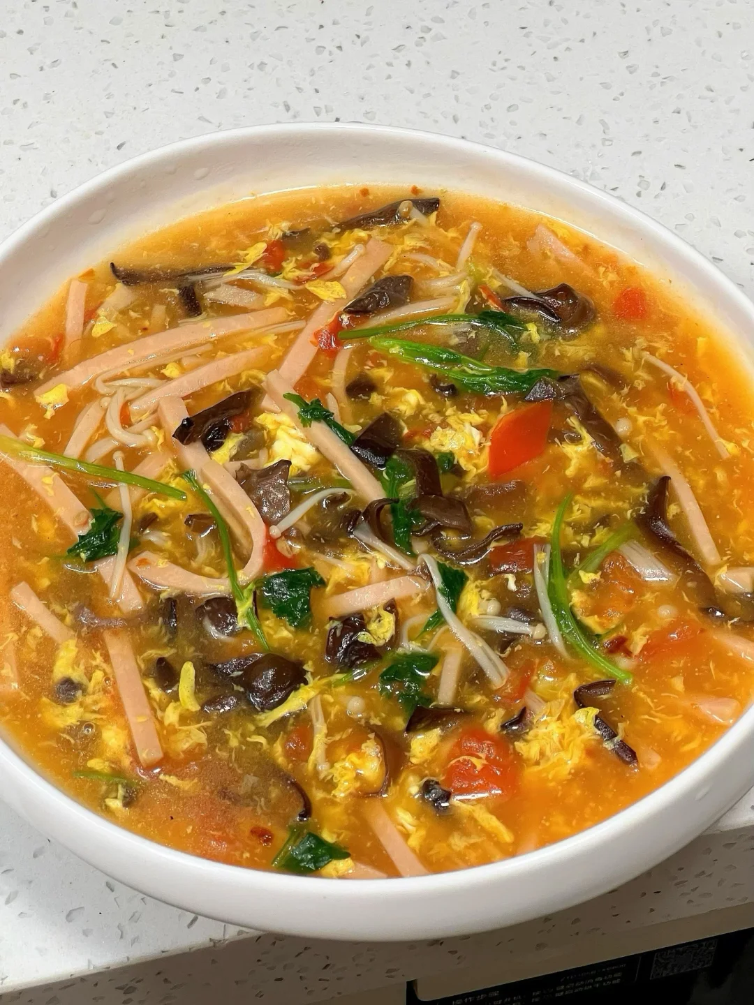汤汁浓郁,开胃解腻 本江西人第一次喝,一口气干了两碗[赞R][赞R] 📝食材准备 西红柿|金针菇|黑木耳|火腿肠|香菜|鸡蛋 (大家可以根据个人喜爱调整,加点虾仁、豆腐啥的也行) 🧑🏻🍳做法简单 1.西红柿去皮切碎,油热下西红柿炒出沙,加水煮沸腾 2.火腿肠、黑木耳、金针菇下锅煮 3.适量玉米淀粉水勾芡 4.加点盐和生抽搅拌均匀 5.淋入鸡蛋液 6.辣椒粉、香菜、鸡精,搅拌均匀 出锅!! (喜欢胡椒味的可以多加点黑胡椒) 减脂低卡又饱腹的酸辣汤 重点!做起来还简单好喝 大家快去做!!