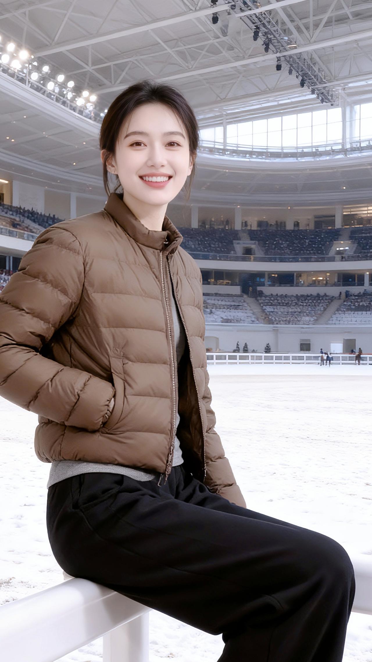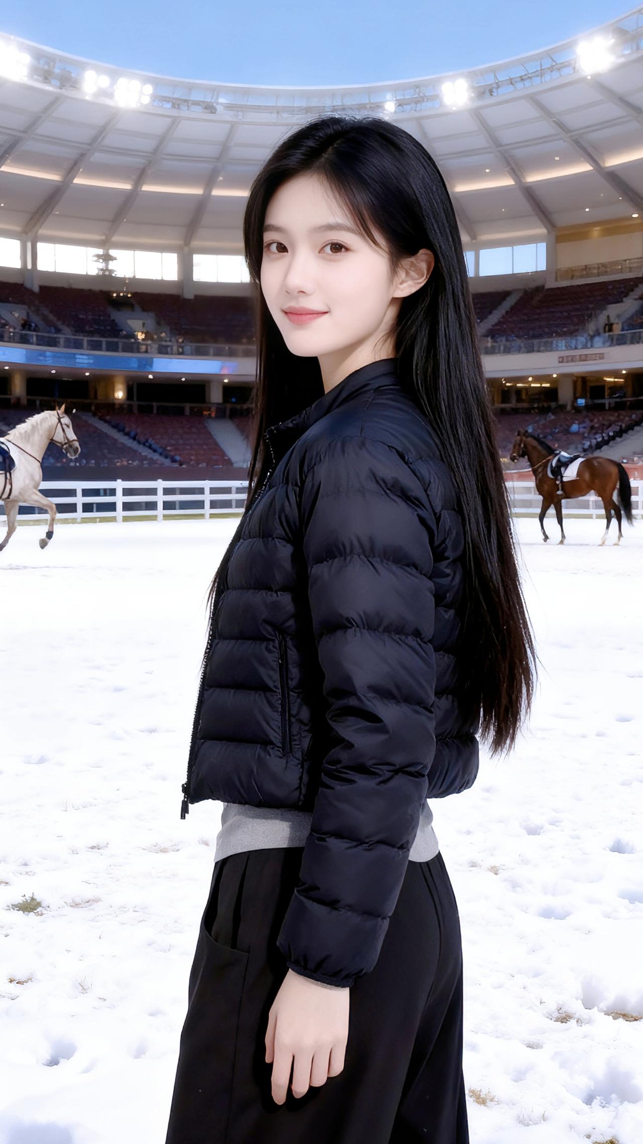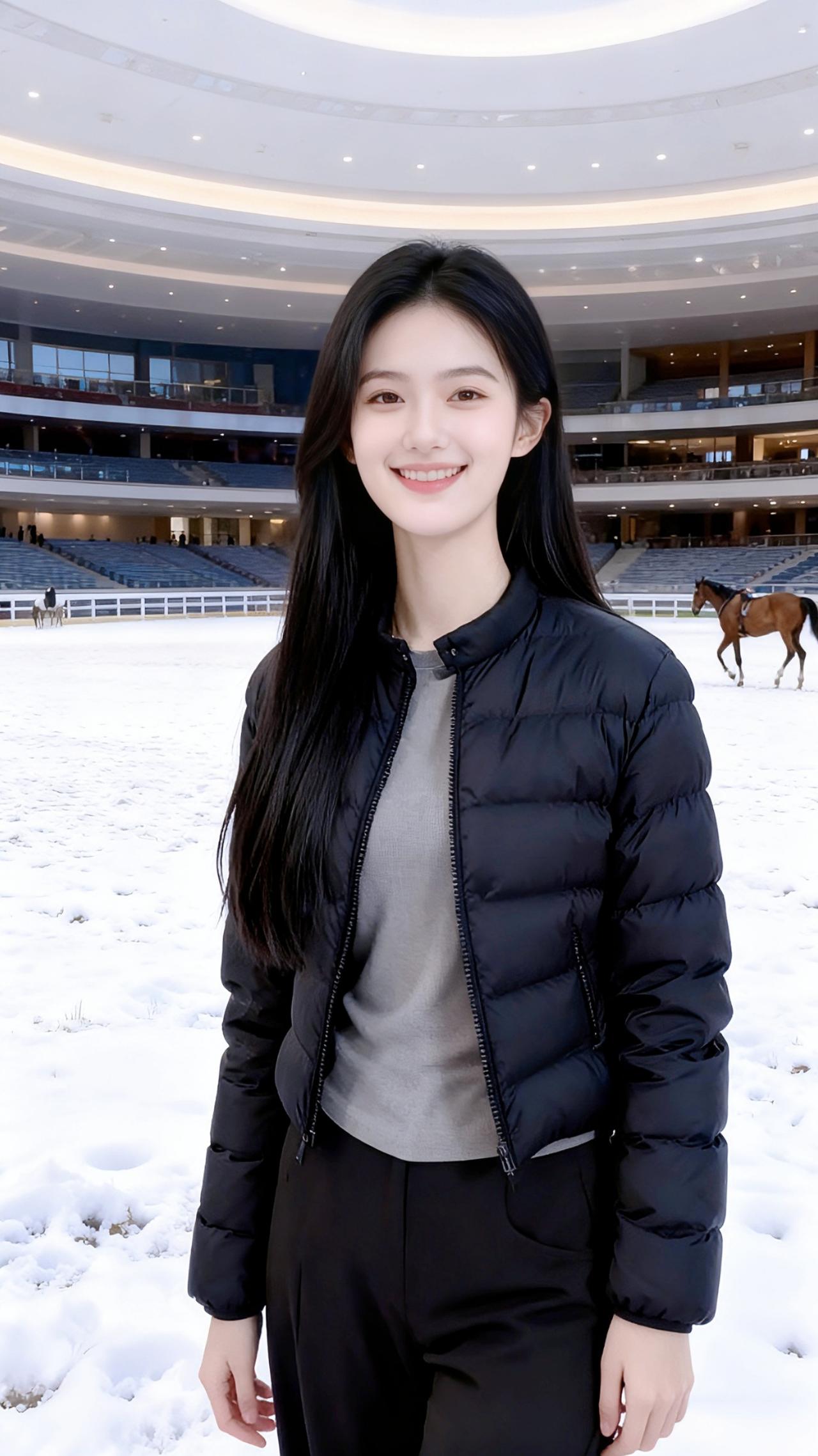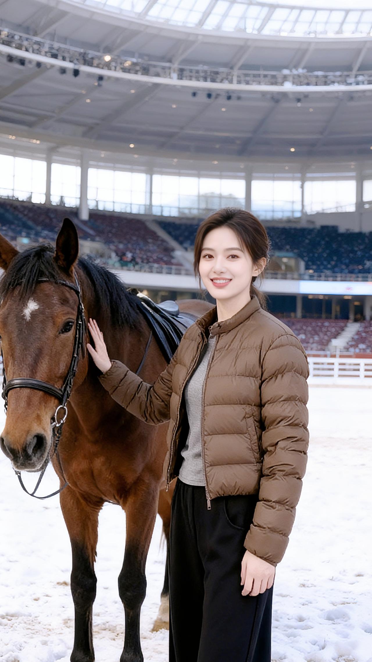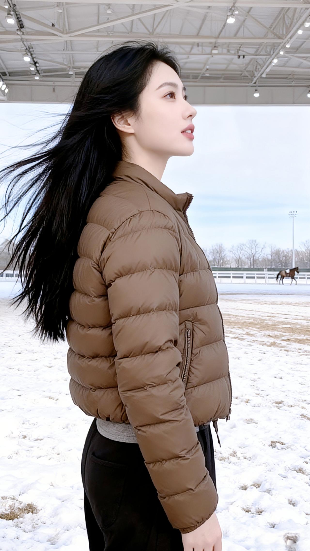 雪落满跑马场的那天,她裹着棕褐色的短绒外套站在白色围栏边,发梢被风掀起一点弧度,像融化在冬日光晕里的星子。 黑色长裤垂坠出松弛的线条,和身后场馆的暖光撞出温柔的边界——那里的穹顶挑得很高,玻璃外的天是淡得发蓝的白,连远处踱步的马都成了背景里温驯的色块。她偏头笑的时候,睫毛扫过落雪的光,连风都慢下来,把蓬松的衣摆揉成软乎乎的云。 后来她伸手碰了碰马的鬃毛,暖意顺着指尖漫开。马场的雪没化,像铺了层碎银,而她是这冷调里最鲜活的一笔,把冬日的清冽,都酿成了轻软的甜。 保暖穿搭 冬季穿搭 户外服装