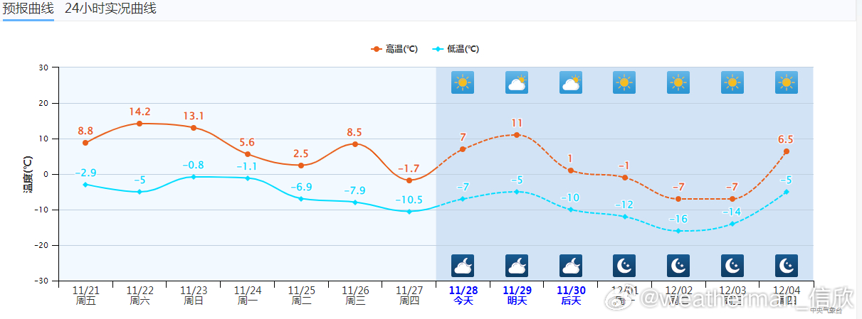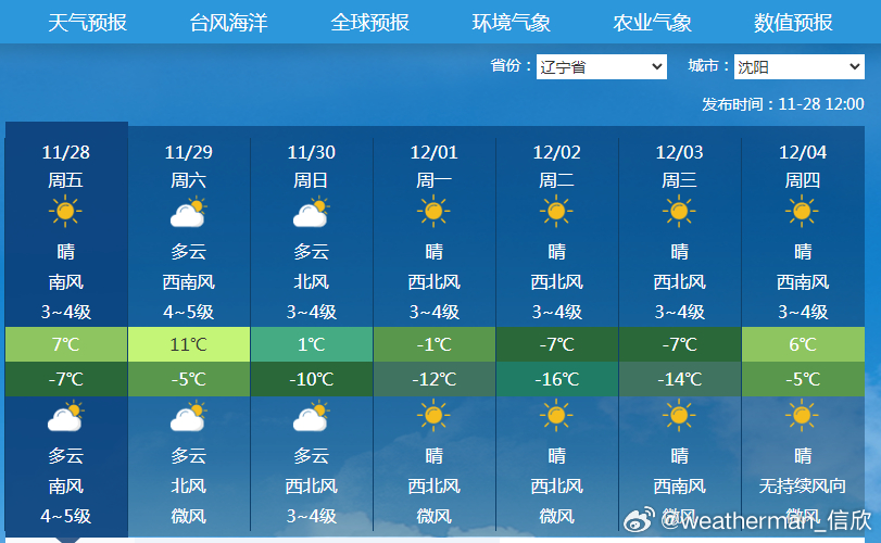 【沈阳气温过山车】今天凌晨,沈阳最低气温降至零下11.5℃,为立冬后首次跌破零下10℃,创出下半年新低。今天白天和明天,沈阳气温大幅回升,明天最高可达11℃。不过之后冷空气源源不断,11月30日最高气温骤降10℃,只有1℃。随后继续下滑,12月2日最高零下7℃。累积降温可达18℃。不过12月4日沈阳气温可能重返0℃以上。未来气温波动很大,如同坐上过山车。