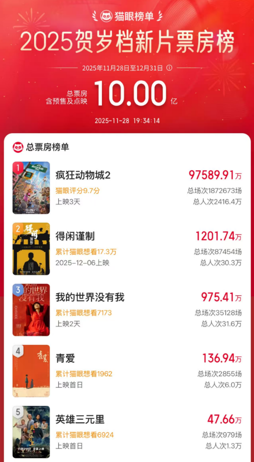 上证报中国证券网讯(记者杨翔菲)据猫眼专业版数据,截至11月28日19时34分,2025年贺岁档新片总票房已突破10亿元,《疯狂动物城2》《得闲谨制》《我的世界没有我》分列贺岁档票房榜前三位。